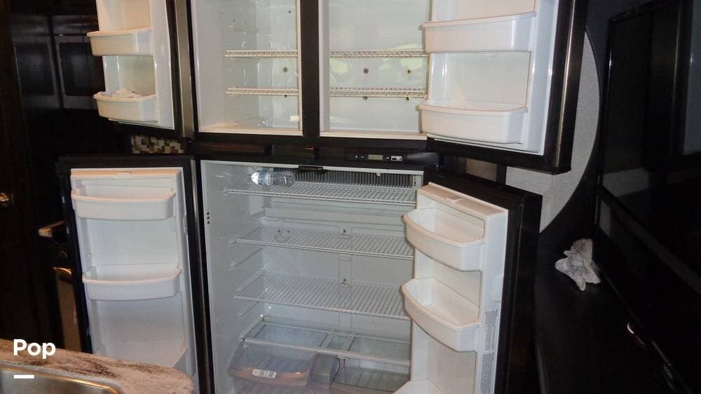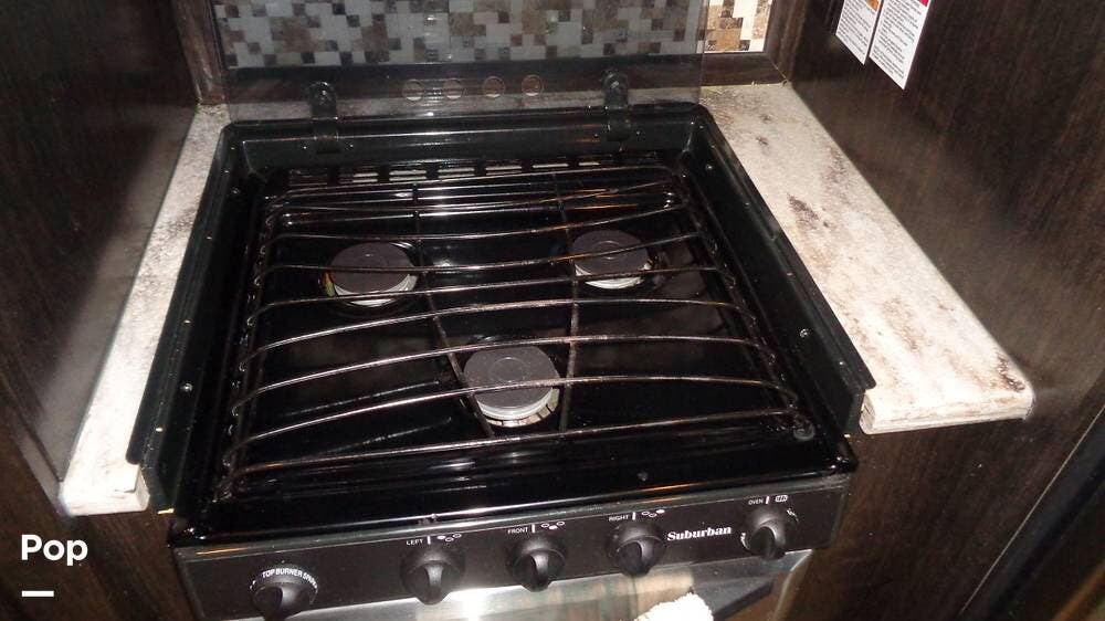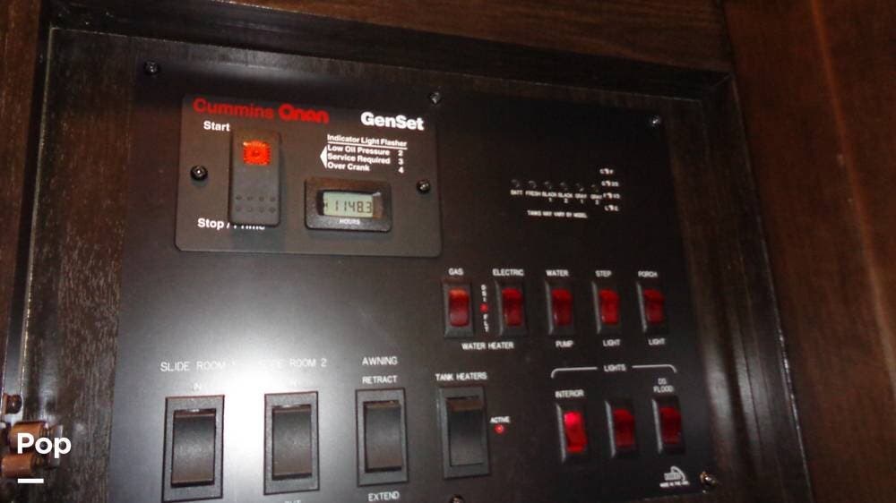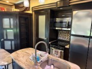 The main living area boasts dual slides, creating an open and inviting space. Relax on the large residential sofa, enjoy entertainment on the large LED TV and stereo system, and cozy up by the fireplace.