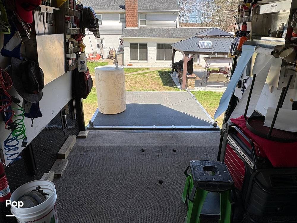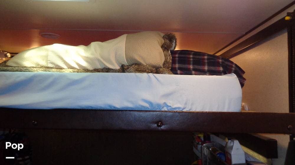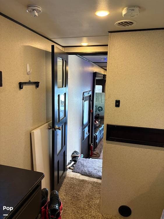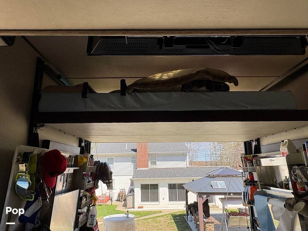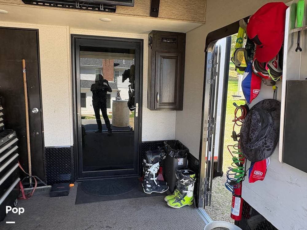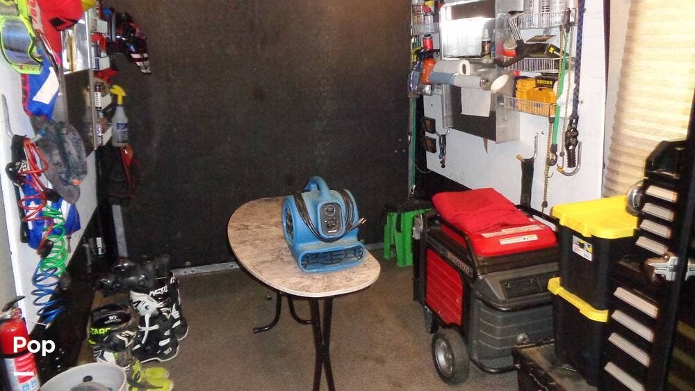 The rear ramp door is well-suited for its main purpose. It lets you easily load and transport your ATVs, motorcycles, or other gear. The garage area also includes an LED TV, side main door access, and two queen-size descending loft beds, offering flexible space for sleeping or storage.