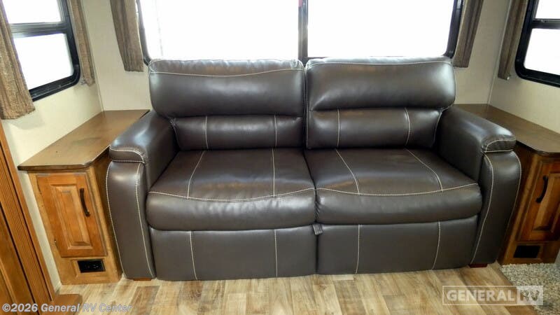 This Grand Design Super Lite fifth wheel model 29RS features an outside entertainment center, triple slides for added interior space, a convenient kitchen island, and more. As you enter you can head right and step up to a side aisle bath and master suite. The bath offers a radius shower with skylight, toilet, corner vanity with sink, and linen cabinet. There is also a second sliding door allowing you access to the bedroom. In the bedroom find a queen size bed, overhead cabinets on either side of the bed, plus above the head of the bed as well. There are also slide out wardrobes for your clothing, plus the linen cabinet that is accessible from within the bathroom. Back down on the main level find a kitchen area with countertop and overhead storage space along the interior living area wall. There is a convenient island with a large sink and counter prep space. The first slide out is along the entrance door wall including a three burner range with microwave above, a refrigerator, and an entertainment center with 32" TV plus a fireplace. Across the rear wall of this Reflection unit you will enjoy a tri-fold hide-a-bed sofa with storage cabinets above to store more camping items. Adjacent, in the second living area slide out you will find theater seating for two and an optional free standing dinette instead of a booth dinette. If relaxing in the great outdoors sounds good, the outside entertainment center will probably be your favorite feature!