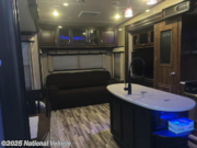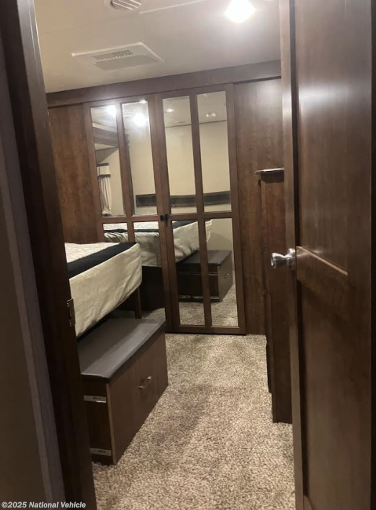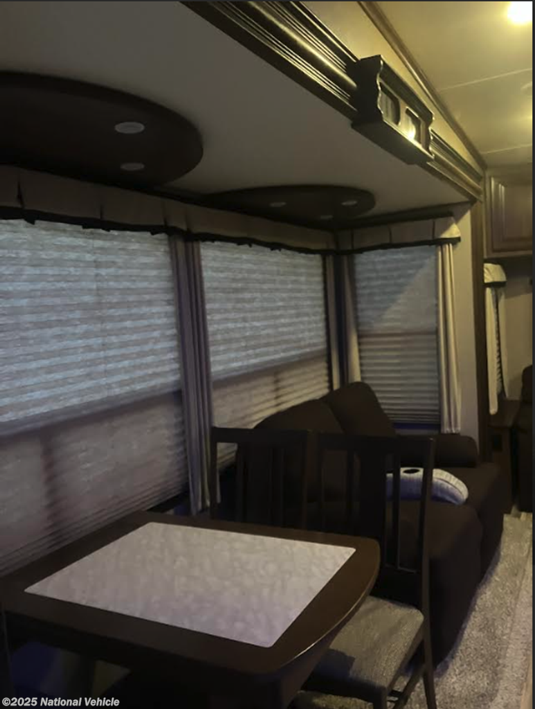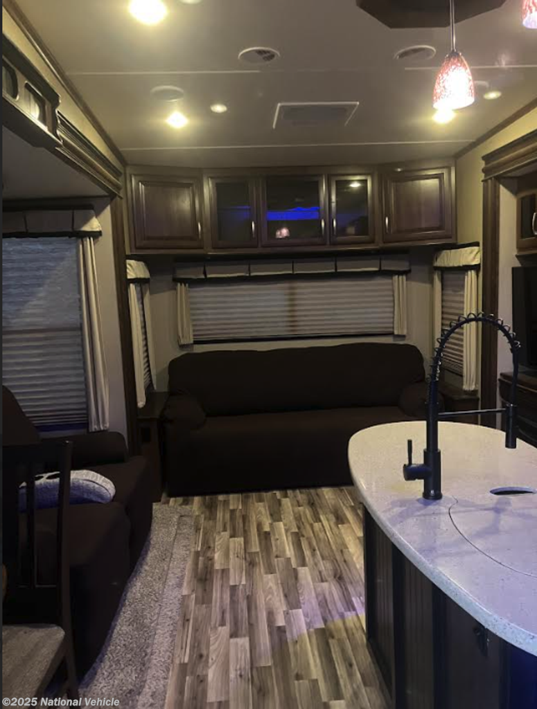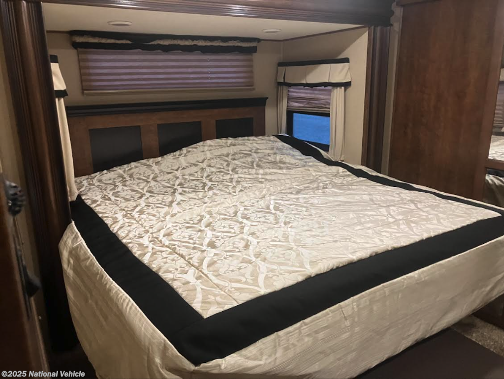 Inside, the spacious rear living floorplan welcomes you with plush seating, expansive windows, and an open, airy feel that rivals high-end residential spaces. The elegant d?cor, solid wood cabinetry, and premium finishes create a warm, upscale atmosphere perfect for entertaining or relaxing after a day on the road.