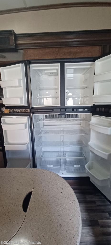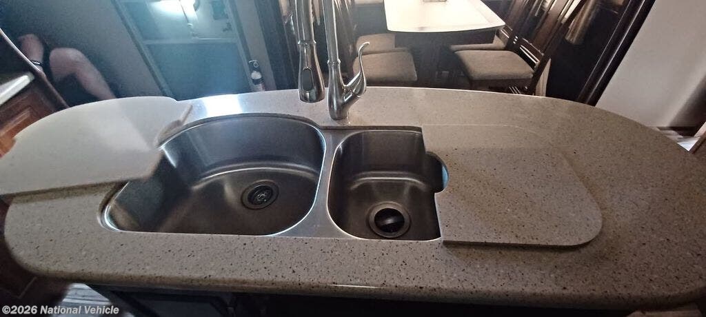 Step inside the entry door closest to the front. As you enter you are in a spacious kitchen featuring dual opposing slides. To your left is a slide out dinette table and chairs. There is a center island with double sinks including counter space. You will find even more counter space on either side of the room along the interior walls with overhead cabinets and base cabinet storage also. The slide opposite the dinette features a large pantry, a three burner range with overhead microwave oven, and a four door side by side refrigerator.