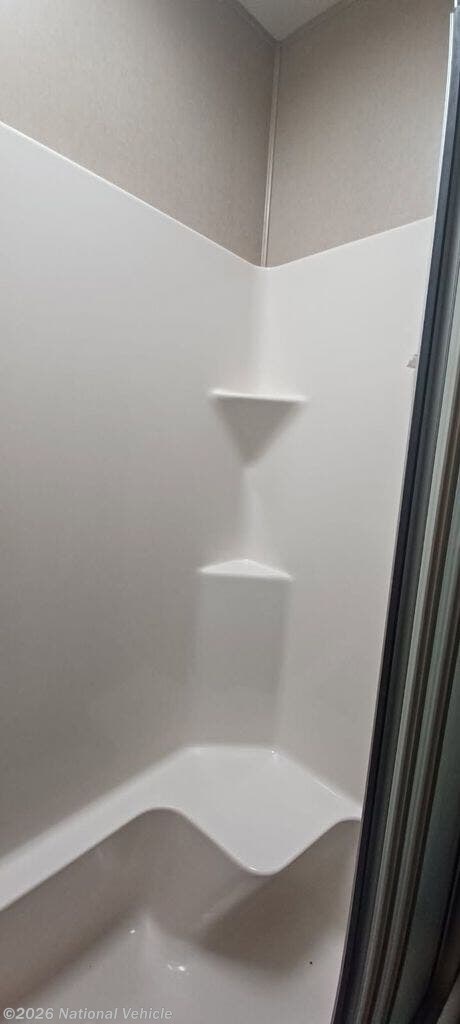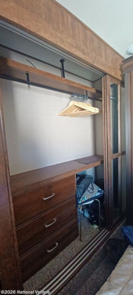 The rear private bedroom with its own entry door features a standard queen size bed slide out. There is a pull-out ottoman at the foot of the bed, and an LED HDTV on the opposite wall. Along the rear wall of the bedroom you will find a double closet with drawers on one side, and a space prepped for a washer and dryer if you choose to add stackable units.