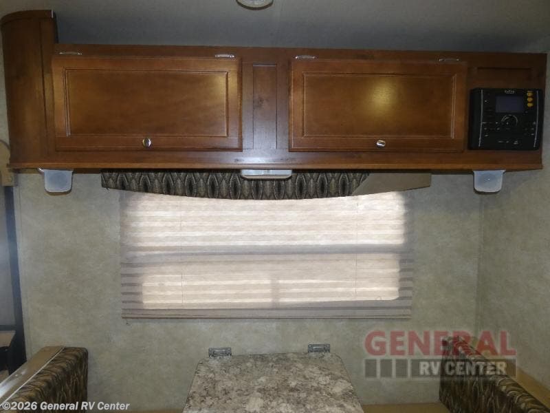 To the left of the door find a booth dinette with overhead storage. The perfect place to enjoy meals and snack, or when playing boards games or just hanging out. It can also be converted quickly to offer another sleeping space at night for extra family or guests. There is a TV mount on the opposite wall which would make it easy to view.