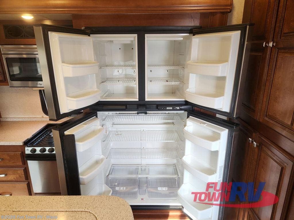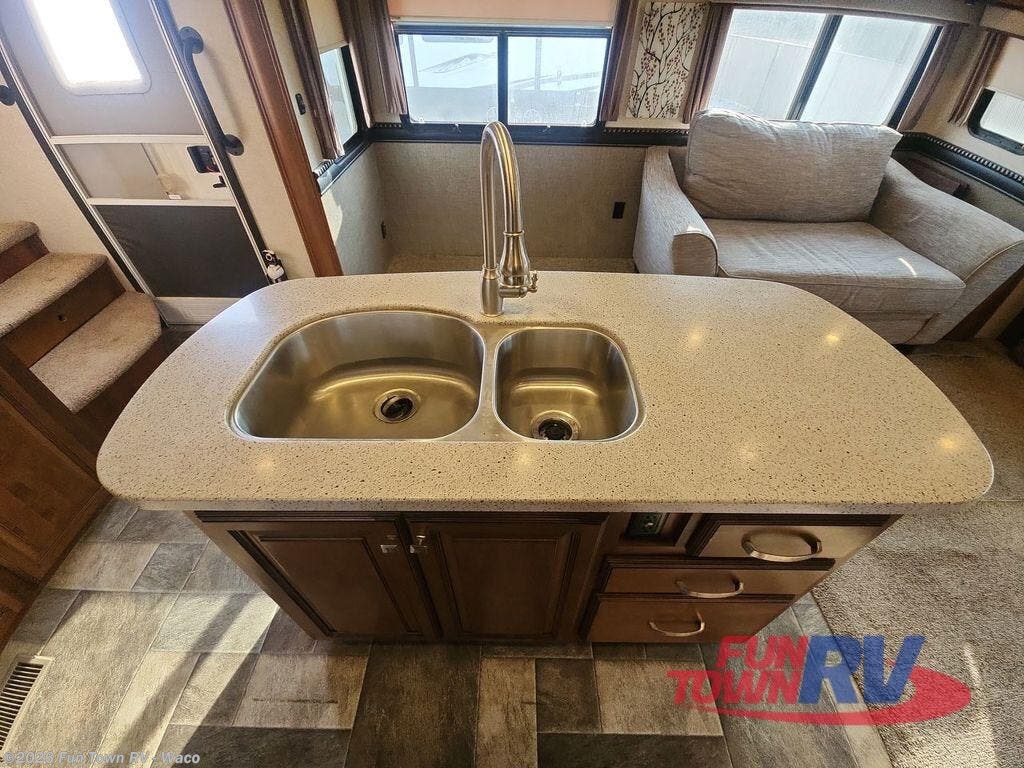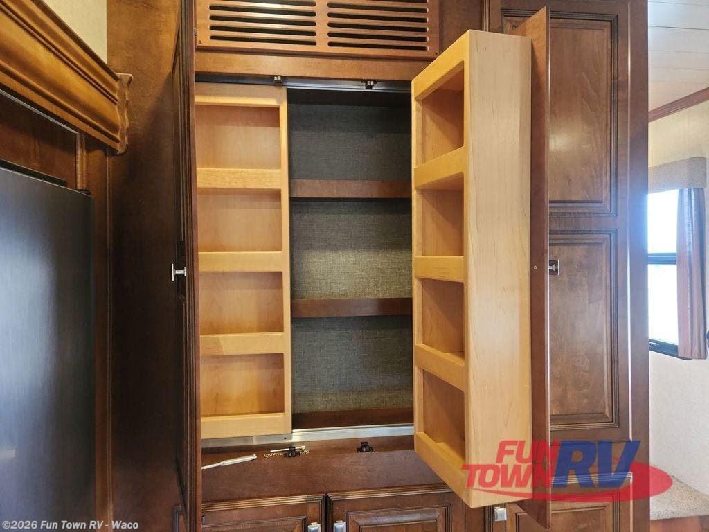 The slide opposite the door side provides an entertainment center with pull-out desk, some counter space, and a three burner range next to a double door refrigerator. The double sink can be found in the nearby kitchen island which also provides added storage and more counter-top prep space. There is a floor to ceiling storage pantry along the interior wall straight in from the door.