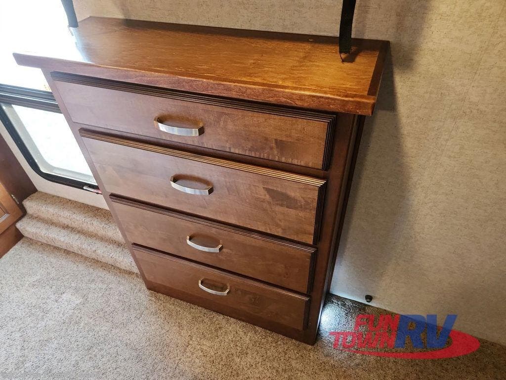 The front of this Bighorn model is where you can relax and unwind on a king bed slide out. Here you can enjoy a great night's sleep. There is a dresser opposite the bed, along with a front closet for hanging clothes which also features drawer space inside along the road side wall. There is also a corner closet that has been prepped for a washer and dryer if you choose to add for more convenience, plus so much more!