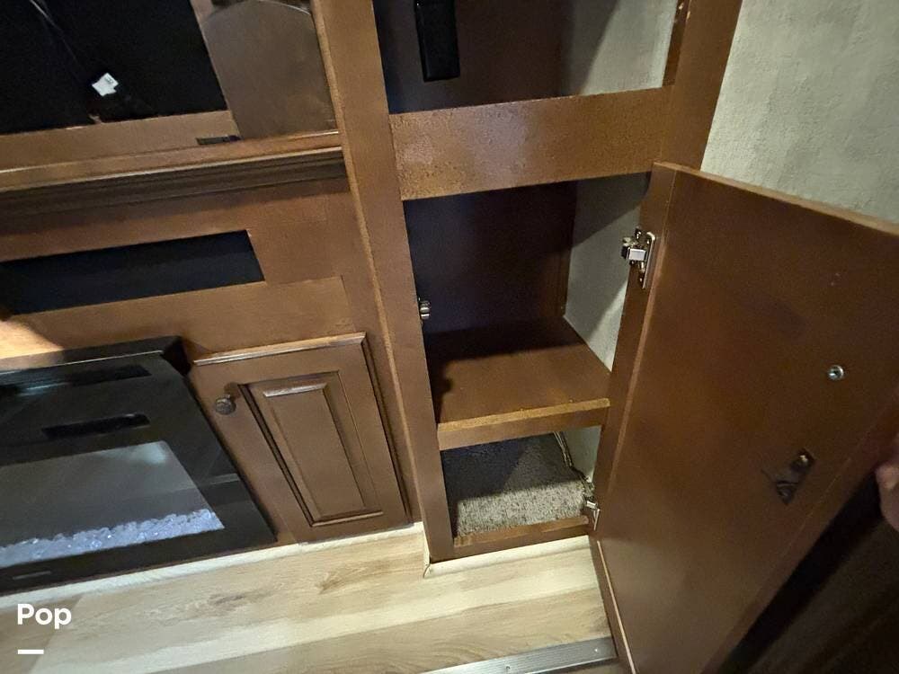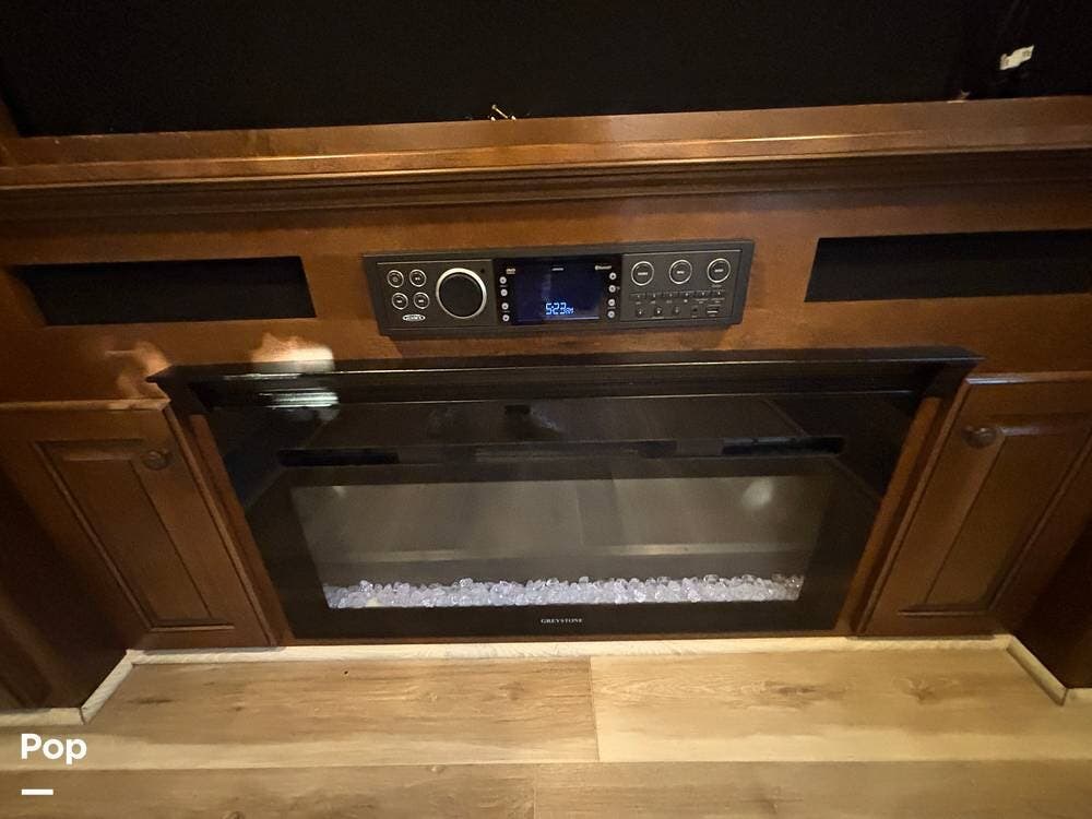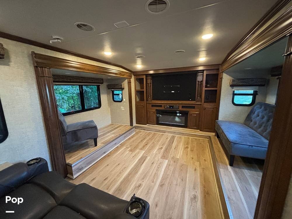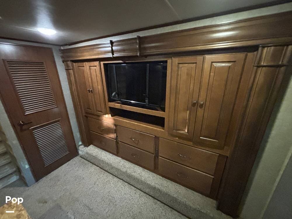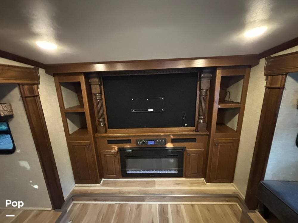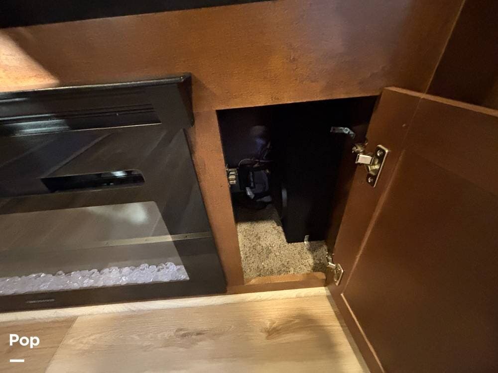 The entertainment center includes a large flat-screen TV, an electric fireplace, and upper cabinetry, making this area ideal for relaxing evenings or hosting guests. With the original tri-fold sofas removed, this space can easily be customized for your preferred seating or multi-use setup.