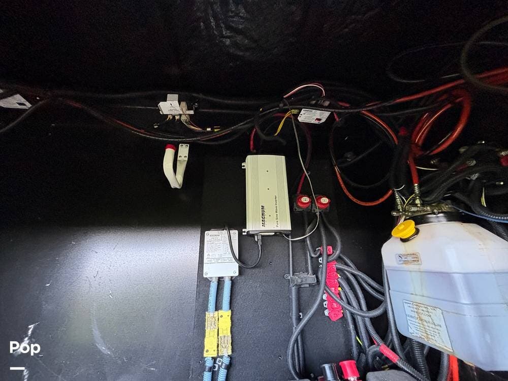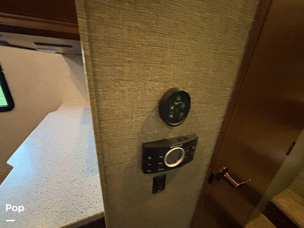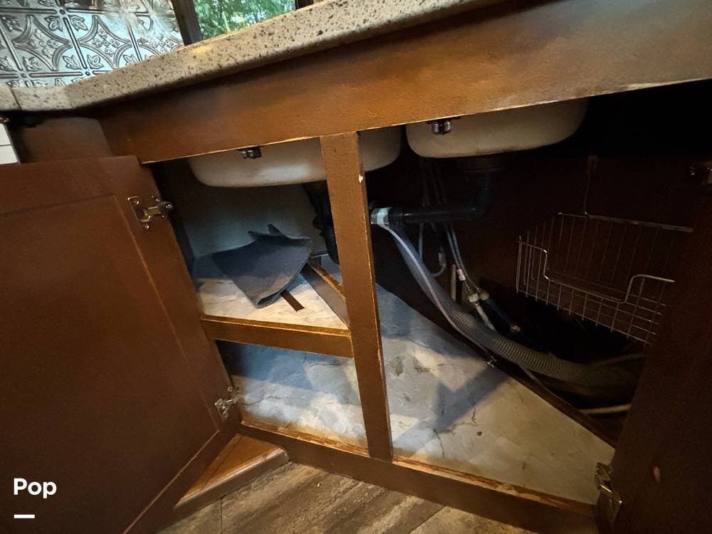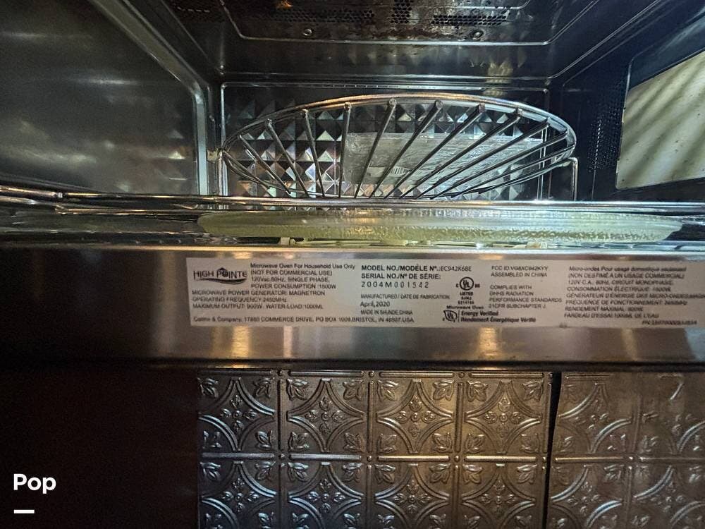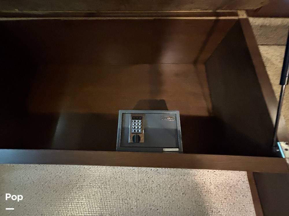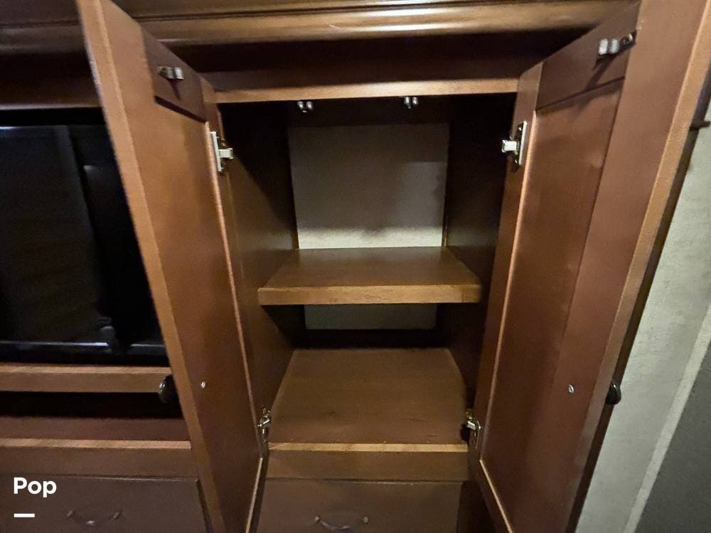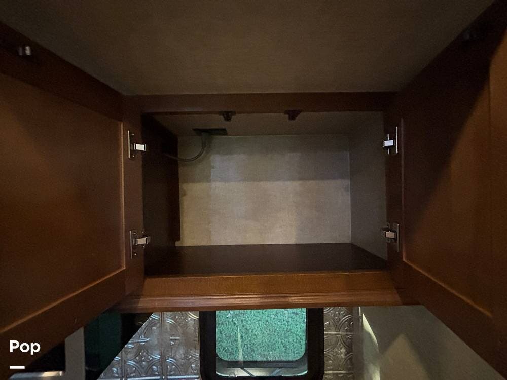 The entertainment center includes a large flat-screen TV, an electric fireplace, and upper cabinetry, making this area ideal for relaxing evenings or hosting guests. With the original tri-fold sofas removed, this space can easily be customized for your preferred seating or multi-use setup.