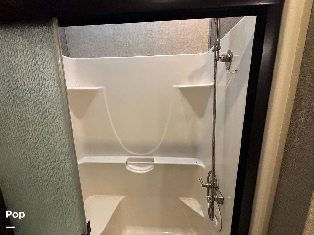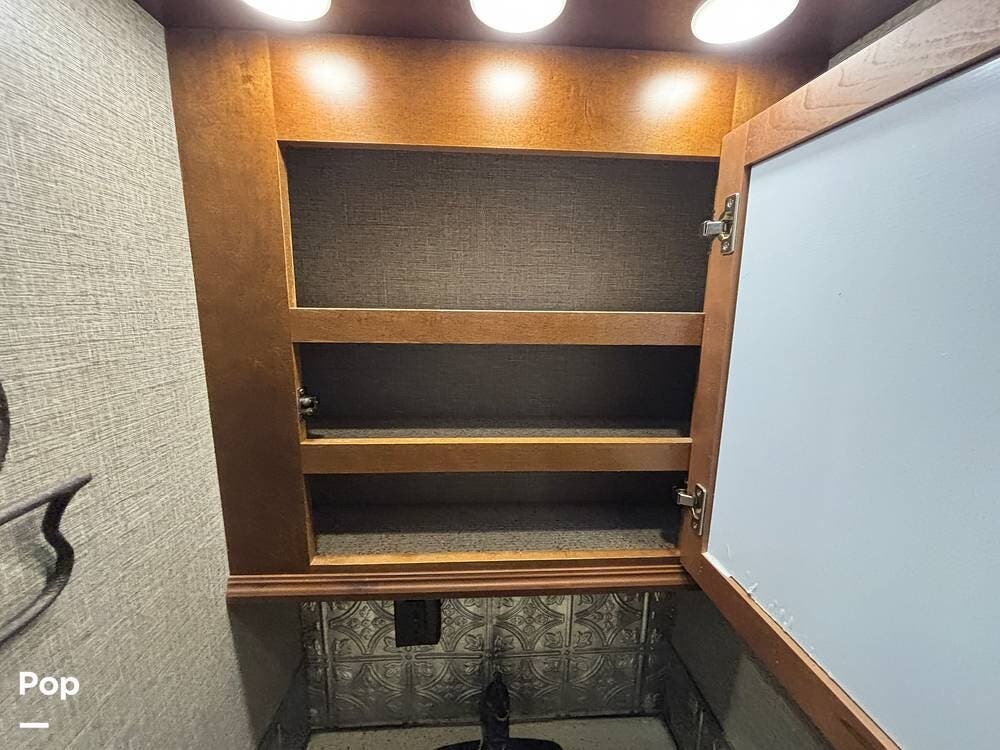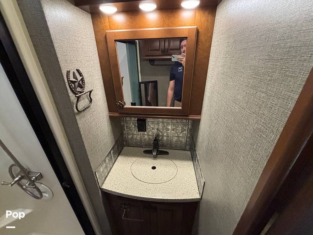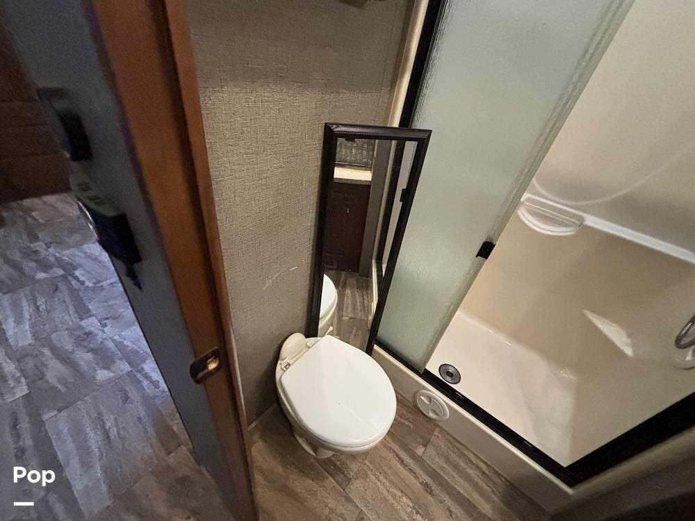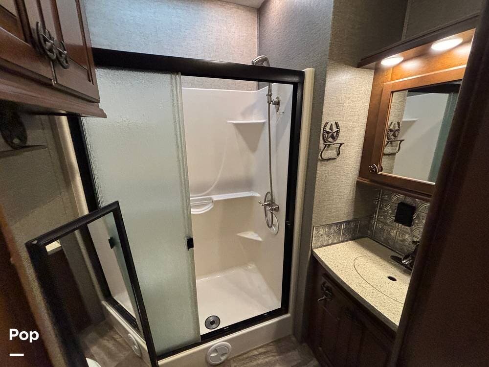 The bathroom is located off the hallway and features a large residential-style shower with a glass enclosure, a porcelain foot-flush toilet, and a solid surface vanity with a mirrored medicine cabinet. Blending durability, warmth, and open-concept living, this 2017 Bighorn 3750FL has been thoughtfully updated for comfort, versatility, and all-season performance--ready to be enjoyed on your next adventure.