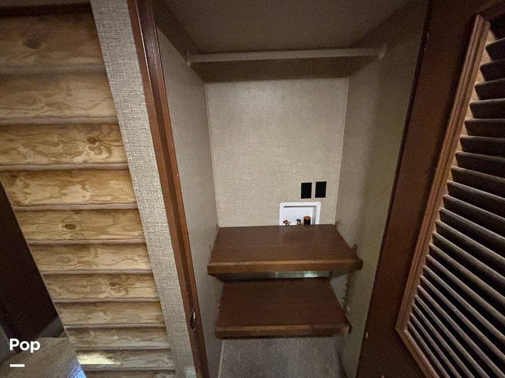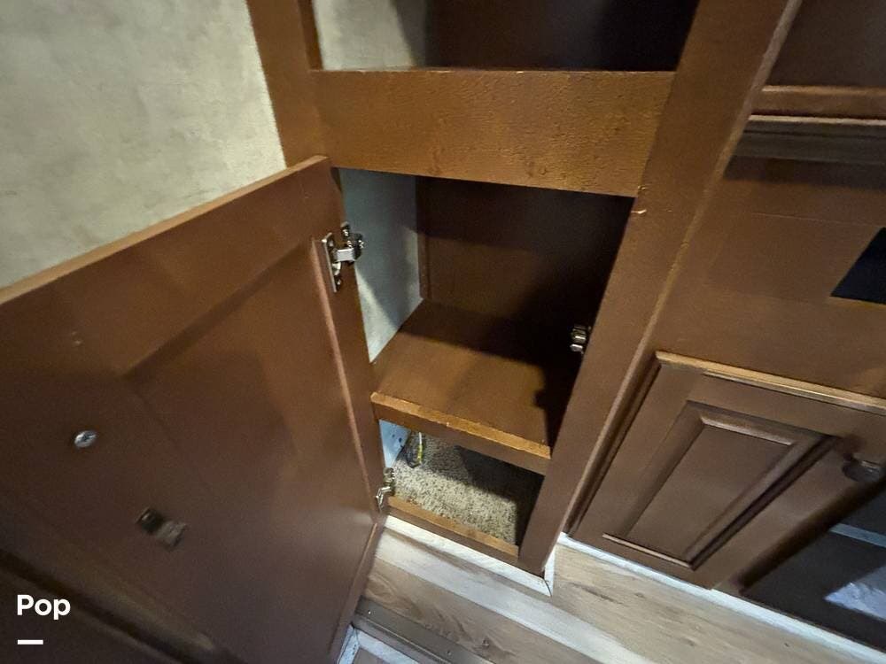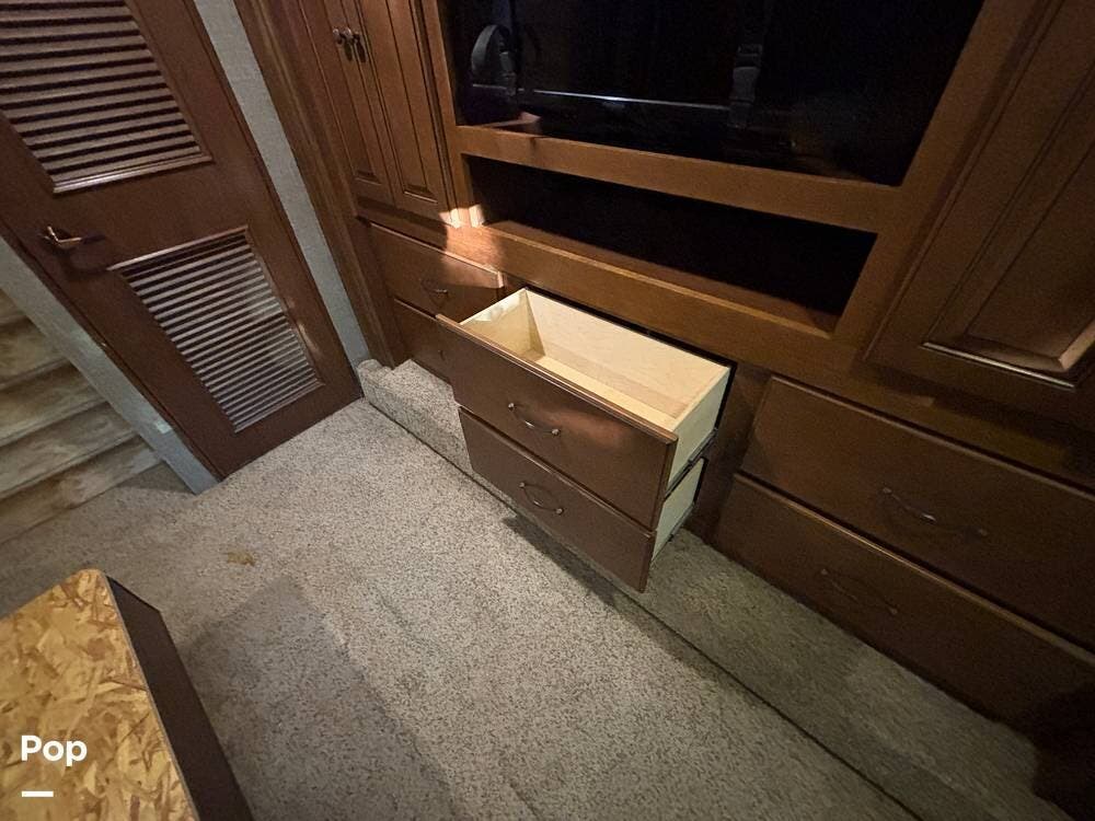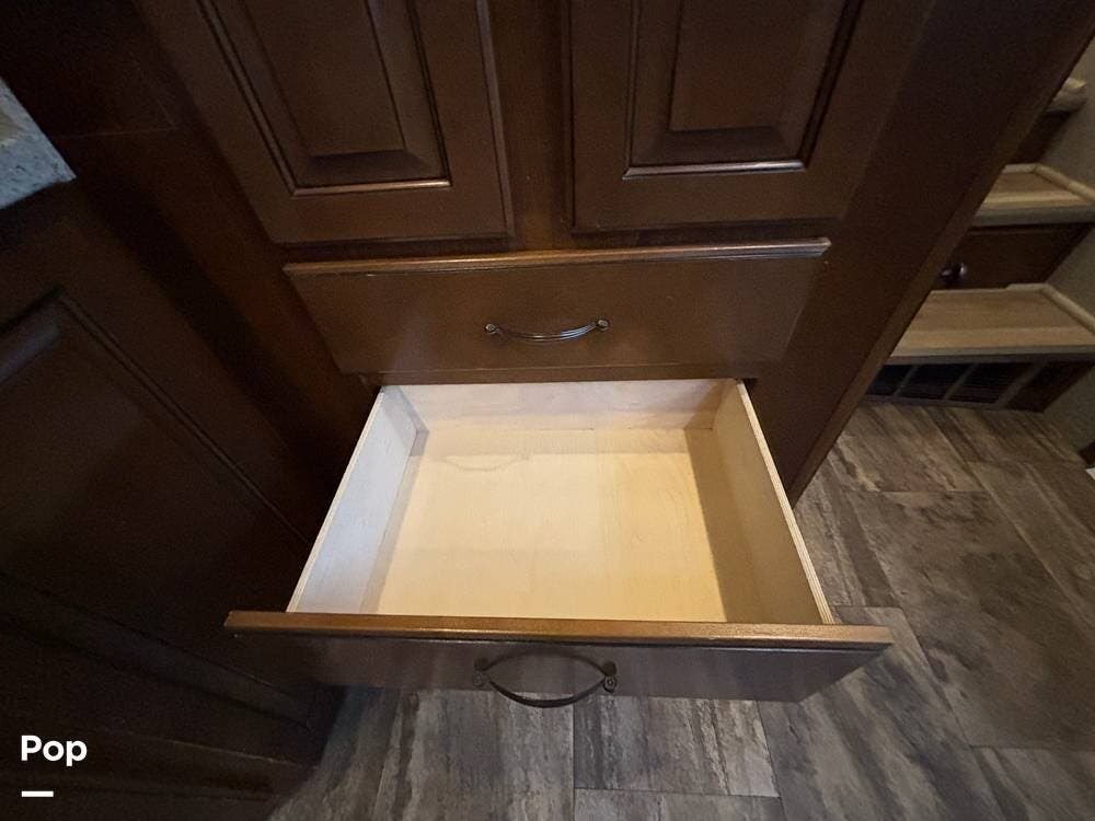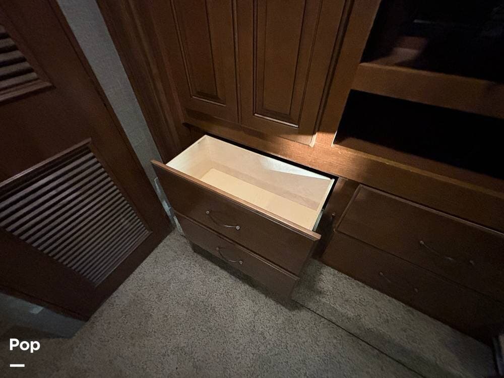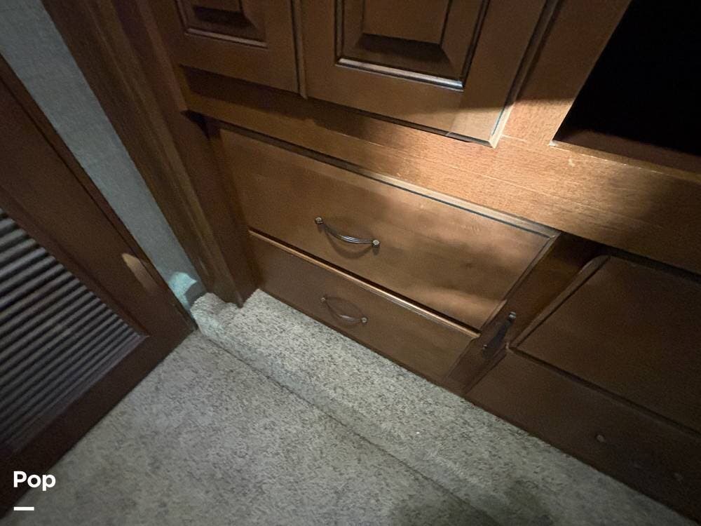 At the rear, the master suite offers a comfortable retreat featuring a residential queen bed on a slide-out, allowing for extra space to move around. A full wall wardrobe and dresser provide abundant storage for clothing and personal items, while washer and dryer prep adds the option for in-unit laundry. The combination of high-end finishes and practical upgrades makes this bedroom both stylish and functional for extended stays.