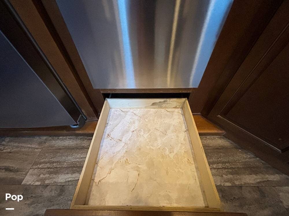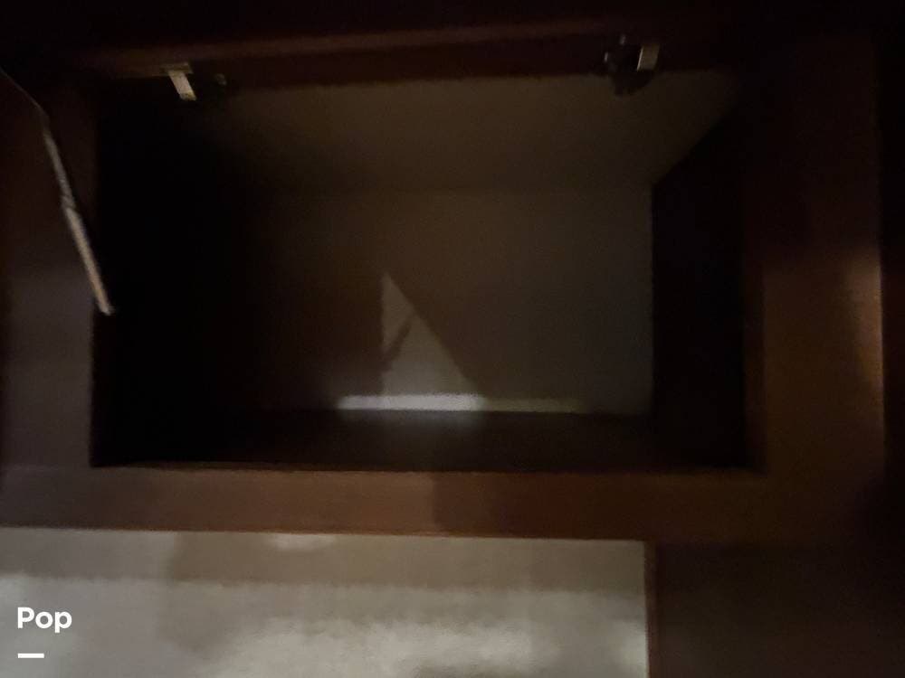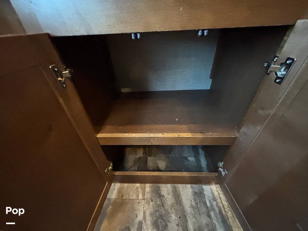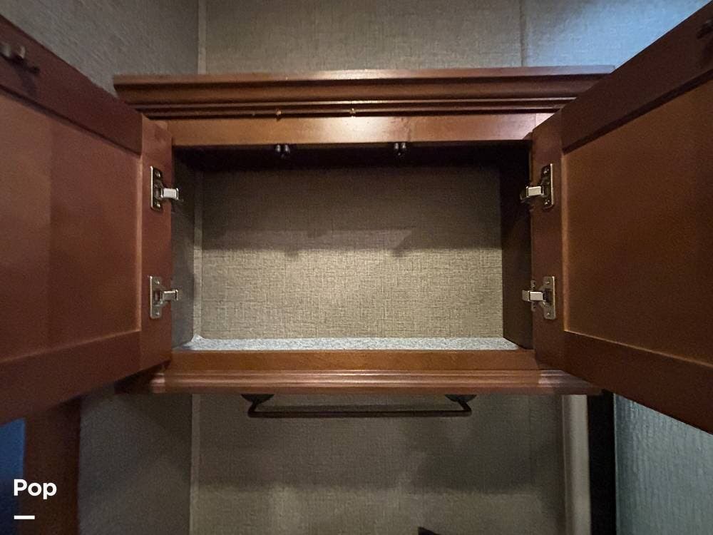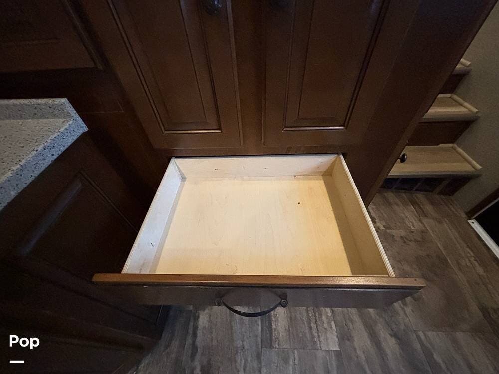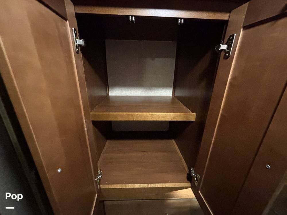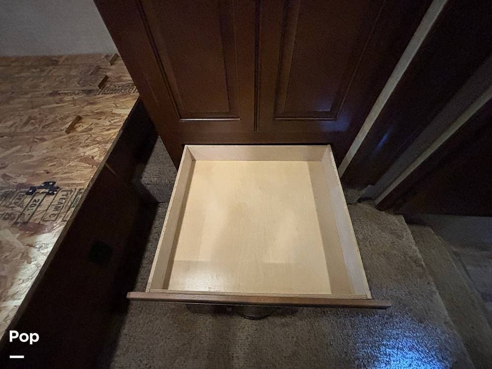 At the rear, the master suite offers a comfortable retreat featuring a residential queen bed on a slide-out, allowing for extra space to move around. A full wall wardrobe and dresser provide abundant storage for clothing and personal items, while washer and dryer prep adds the option for in-unit laundry. The combination of high-end finishes and practical upgrades makes this bedroom both stylish and functional for extended stays.