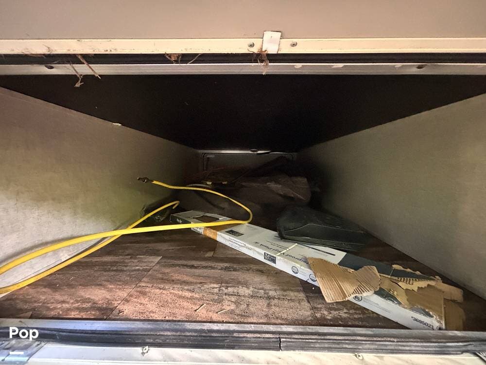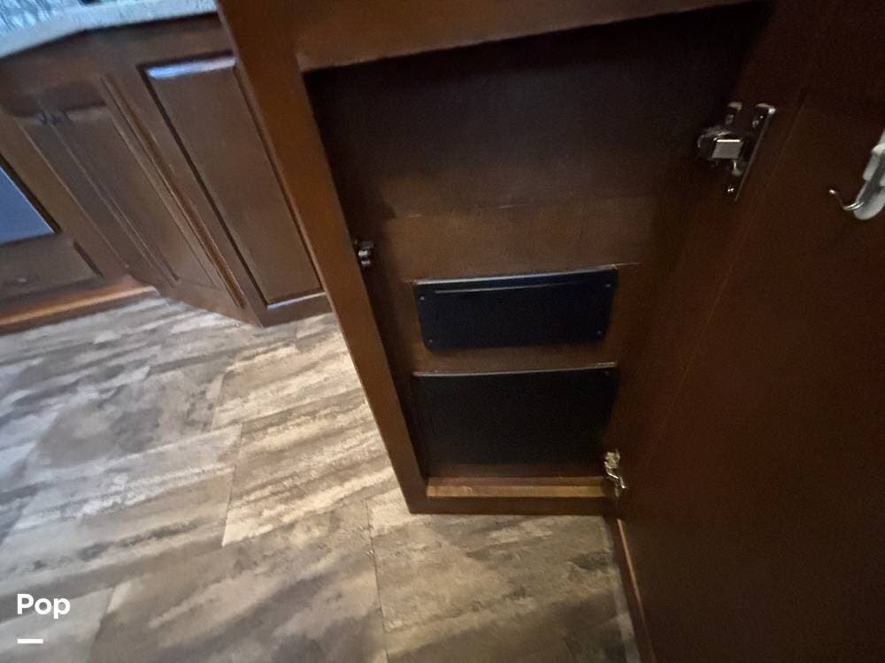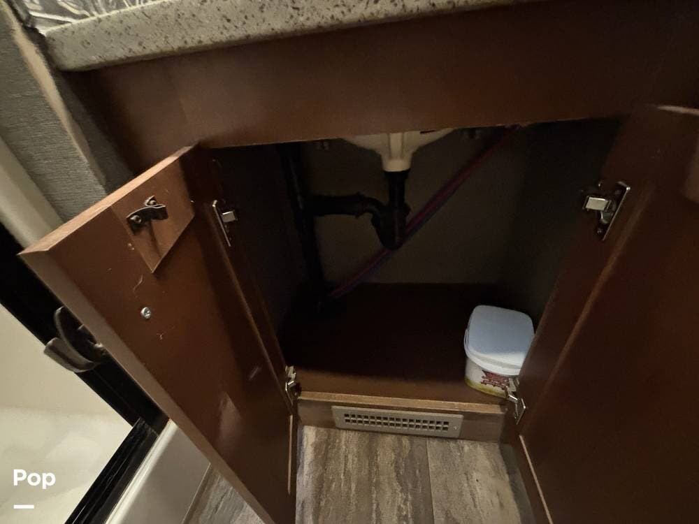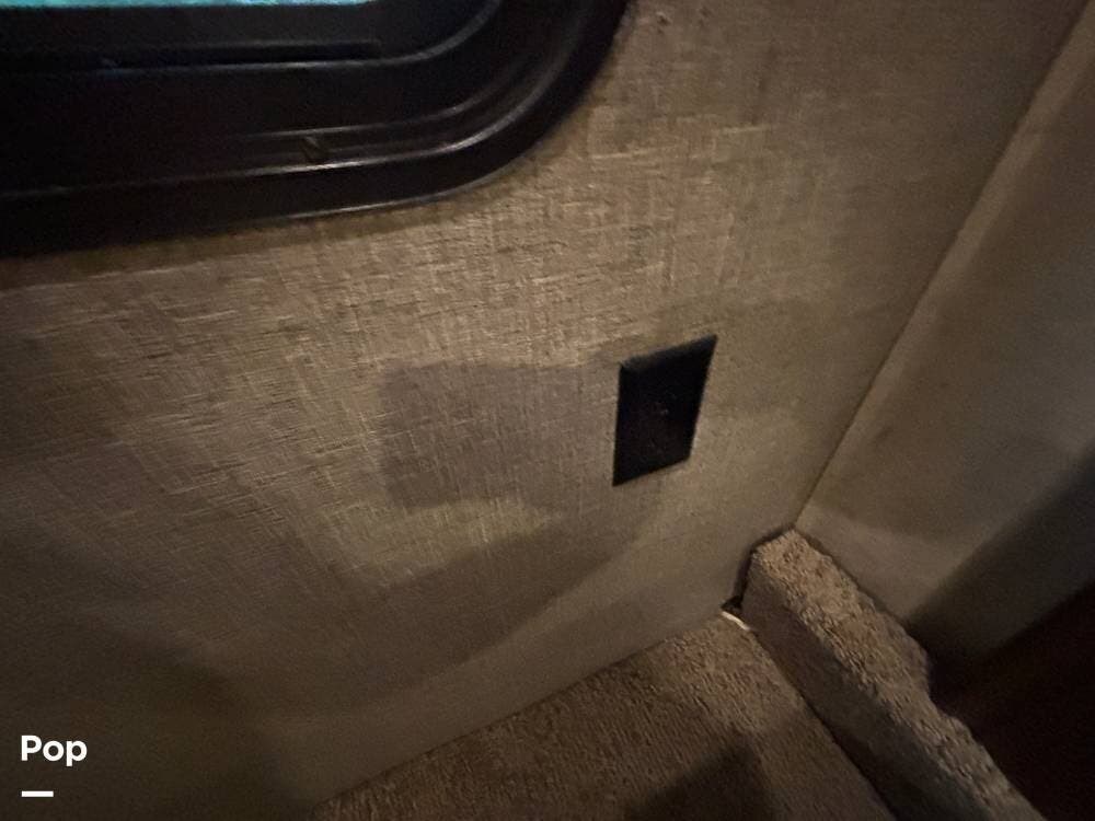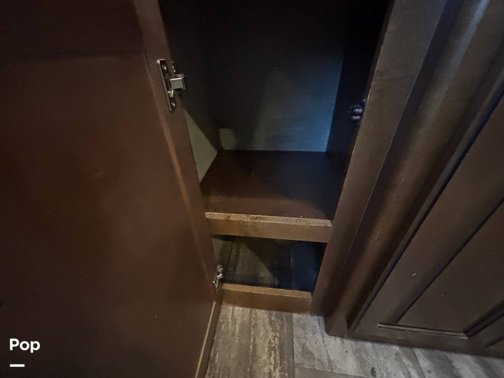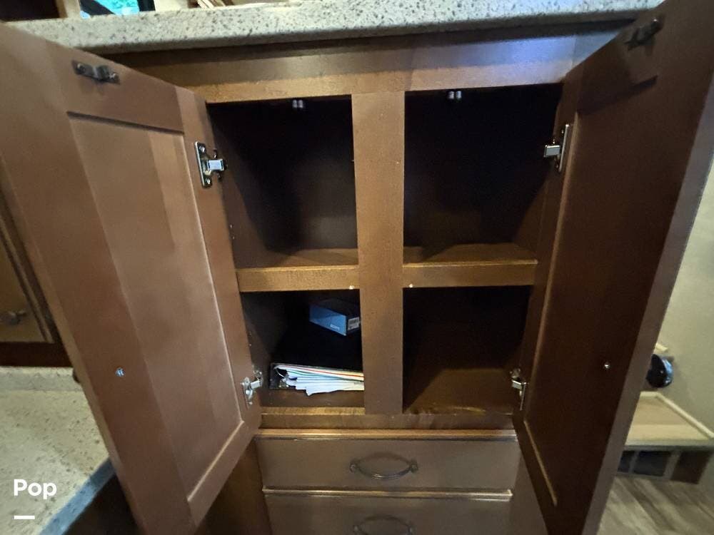 At the rear, the master suite offers a comfortable retreat featuring a residential queen bed on a slide-out, allowing for extra space to move around. A full wall wardrobe and dresser provide abundant storage for clothing and personal items, while washer and dryer prep adds the option for in-unit laundry. The combination of high-end finishes and practical upgrades makes this bedroom both stylish and functional for extended stays.