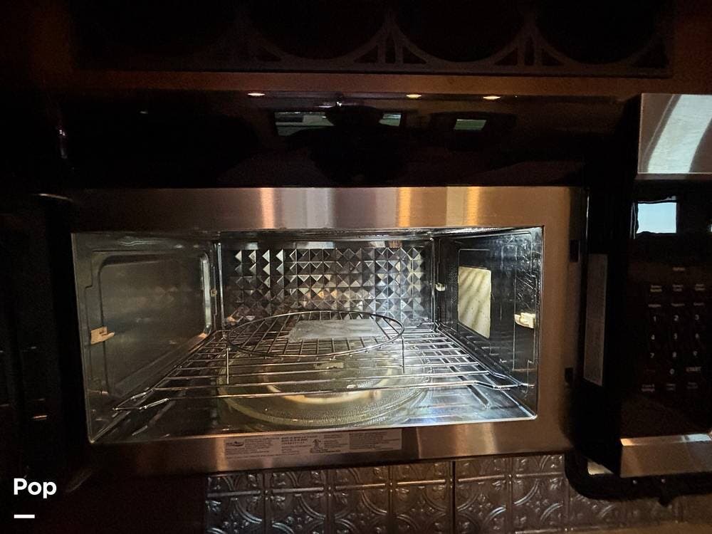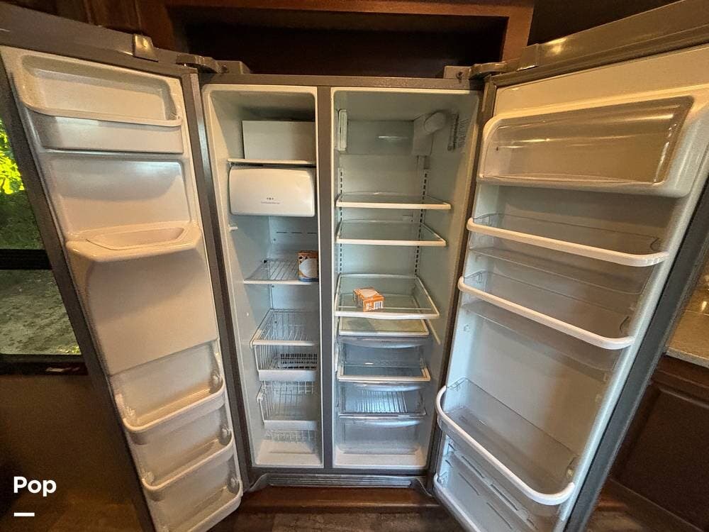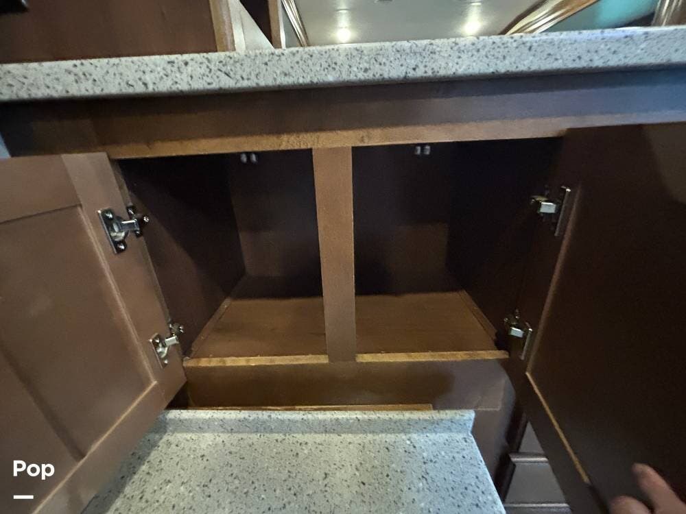 The mid-ship kitchen is designed for convenience and functionality. It features solid surface countertops, a residential refrigerator, a three-burner range with oven, and a convection microwave. The center island provides additional workspace and includes a deep stainless-steel sink with a high-rise faucet. With the freestanding dinette removed, the dining area can serve as a flexible zone -- perfect for a desk, additional cabinetry, or your own dining setup. Ample overhead cabinets and pantry storage provide plenty of room for cookware and supplies.