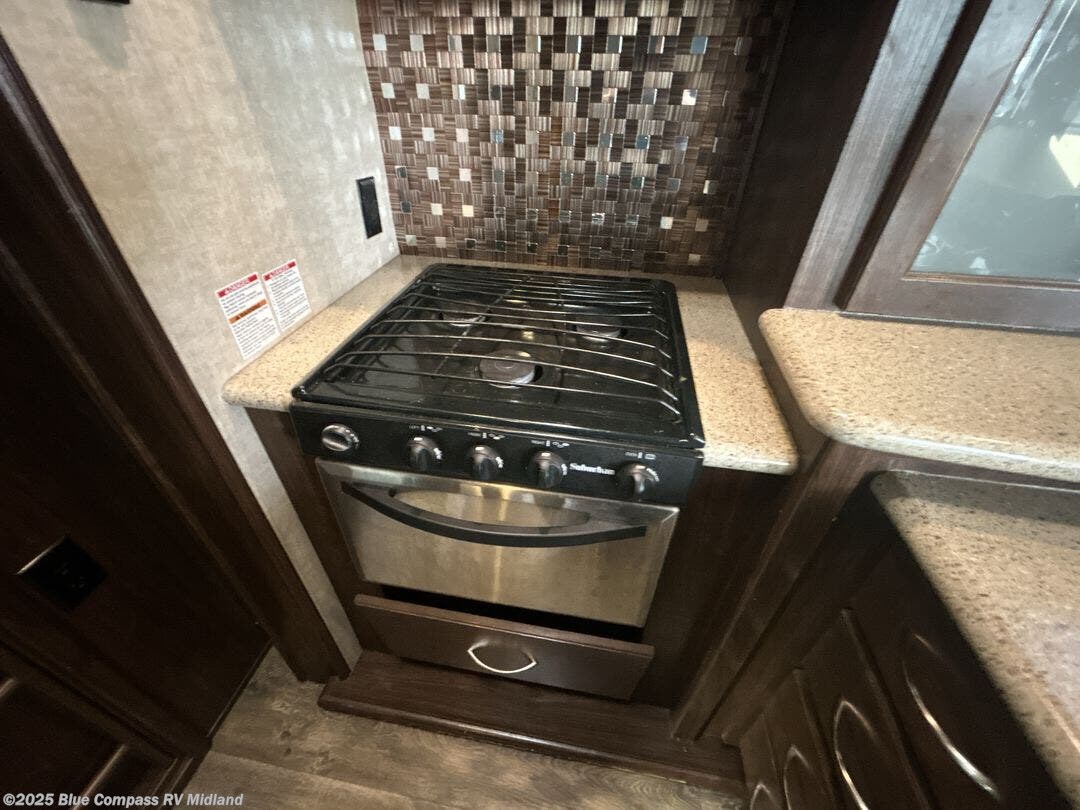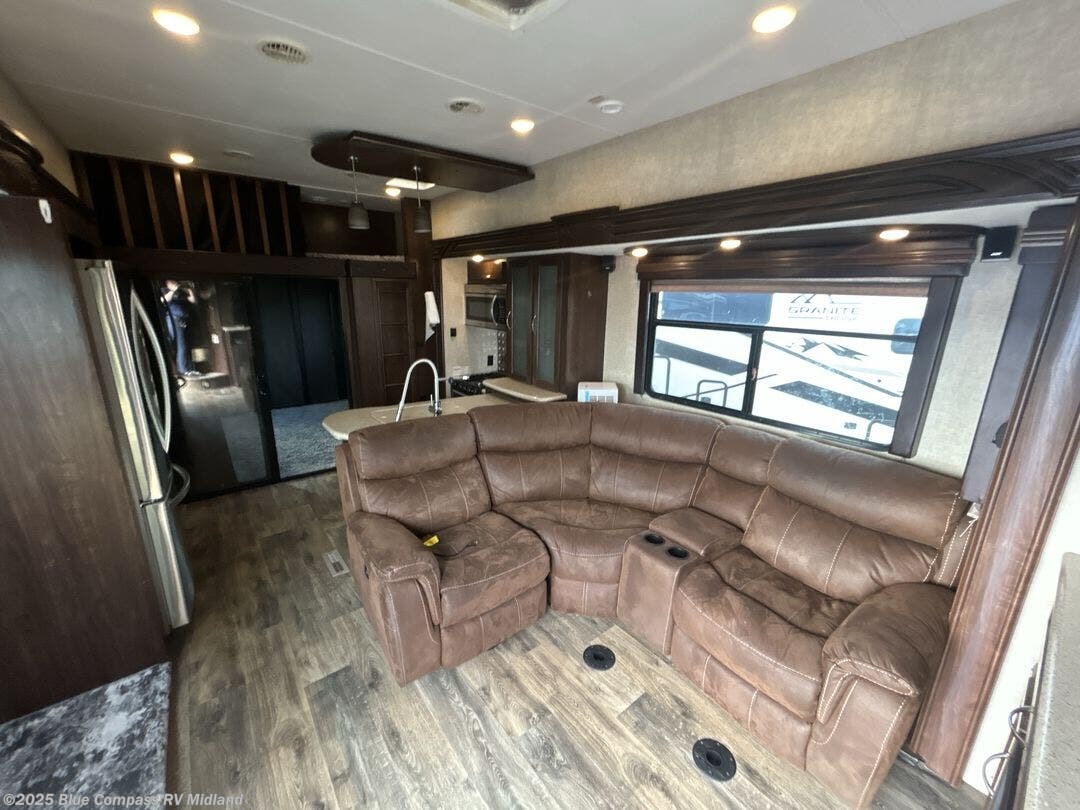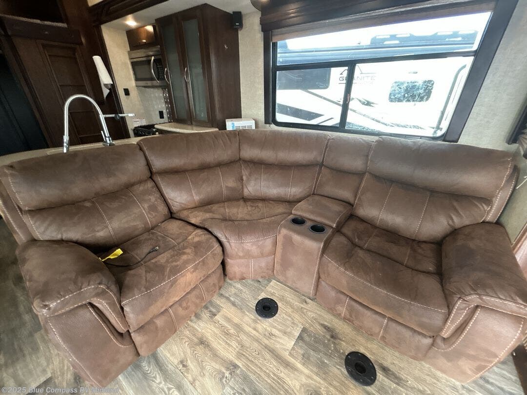 Inside the main living space find dual opposing slides that really open it up providing ample foot traffic room. There is a refrigerator, storage, and a sofa just to the left of the main entry door. On the opposite side find a three burner range, large counter with double sinks, and an L-shaped sofa slide.