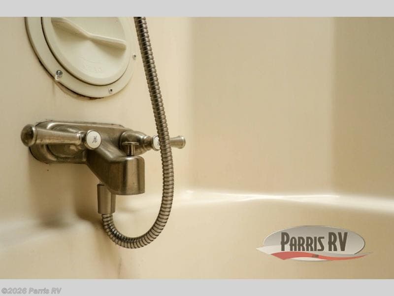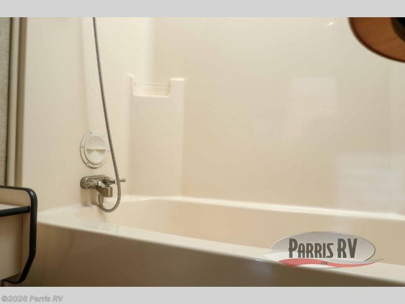 Step up in front to a side aisle bath and front bedroom featuring a sunken tub, toilet, sink with overhead cabinet, plus a second entrance into the bedroom. The front private bedroom offers a king size bed slide, dresser opposite, and corner closet with washer/dryer prep, and a wardrobe with sliding doors, plus so much more! You can even watch TV which slides out from the wall in front of the dresser.