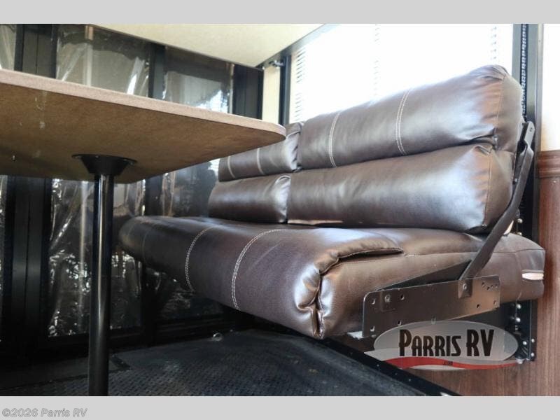 Back inside find a long slide-out including a refrigerator and large sofa with two tables for ample seating for everyone on the road side. Enjoy a flat screen TV that is centrally located for viewing within the main room.