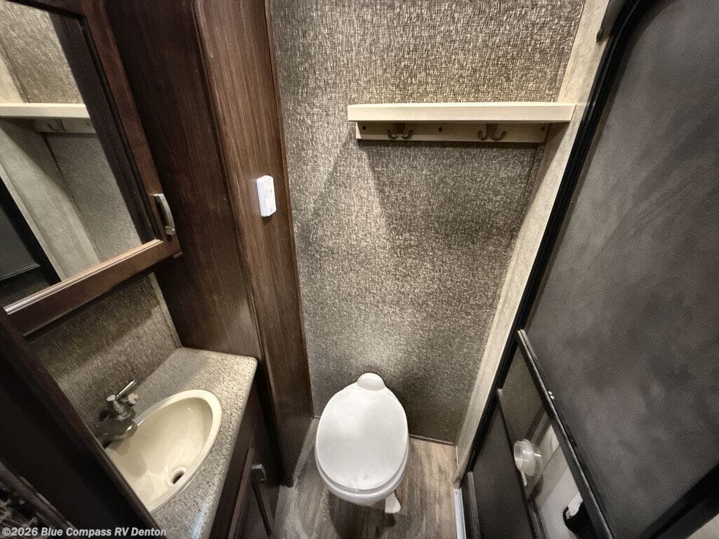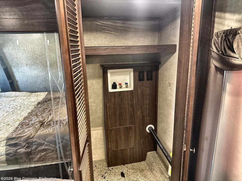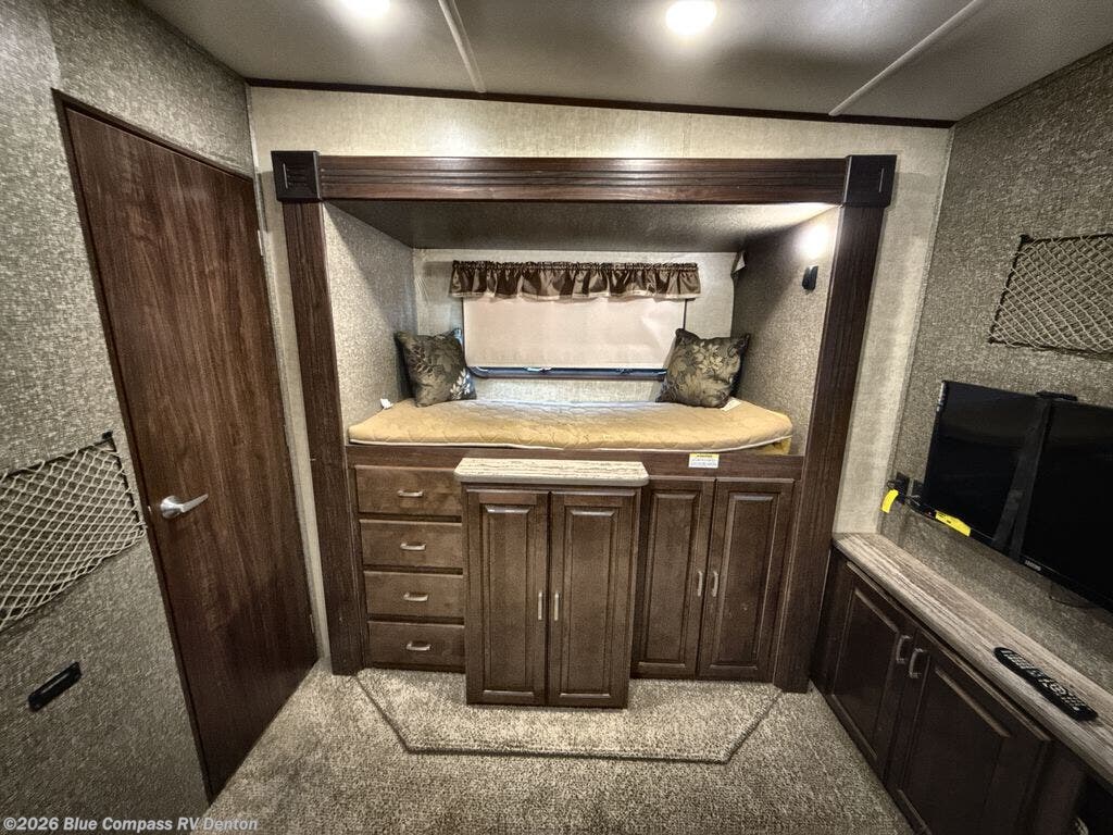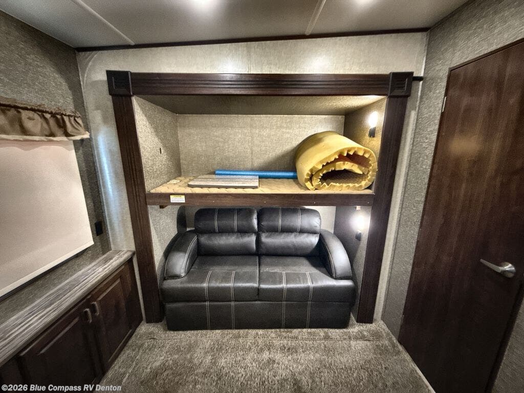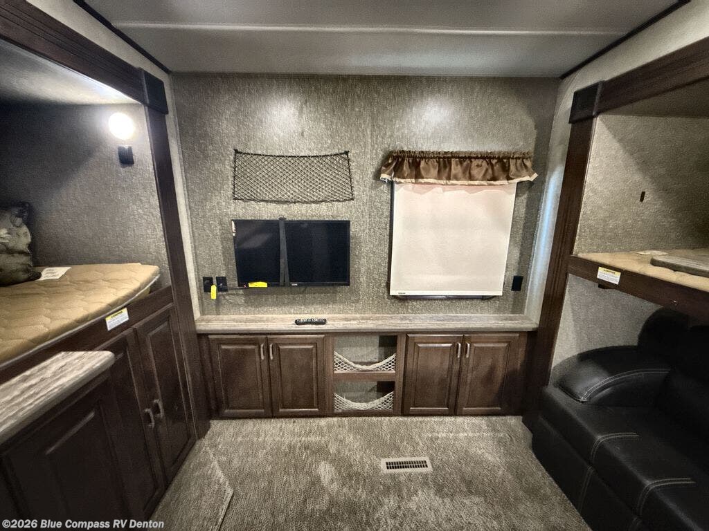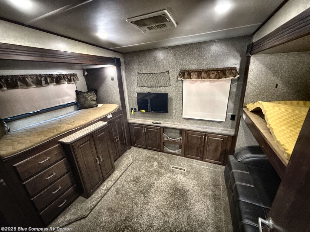Head to the rear of this fifth wheel and find a large private bunkhouse that the kids will want to claim for their own. There is a slide out trundle bed with flip-up bunk above on the right. A removable counter area can be found to the left of the door. There is a bank of drawers with cabinets in the left slide with a third bunk above. Along the outside rear wall you have cabinets and storage shelves, plus a place to add a TV if you like. There is also a half bath off the bunkhouse with toilet, sink, and private entry door.