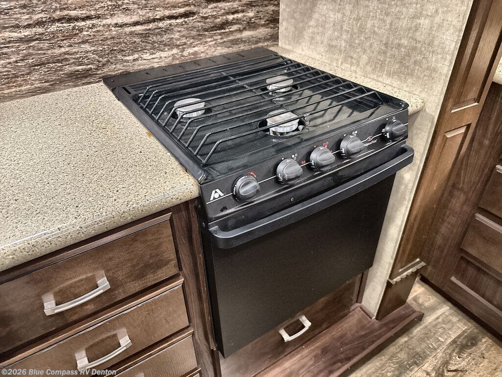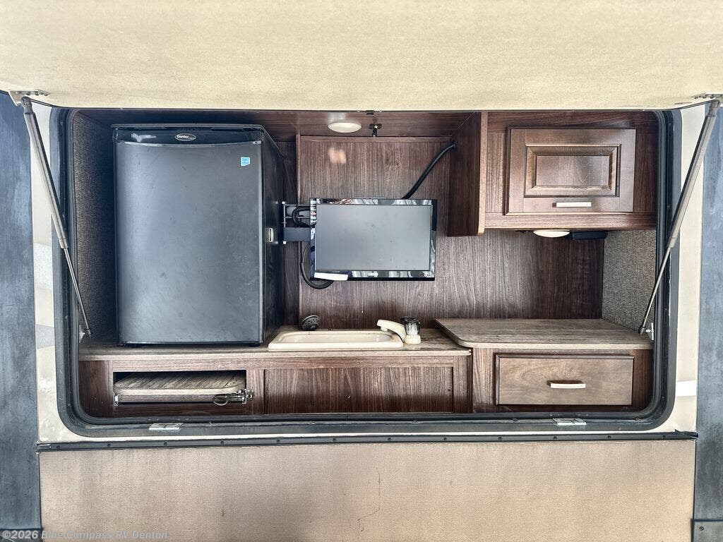 On the outside enjoy a rear side camp kitchen with sink, refrigerator, stove top, and so much more!
