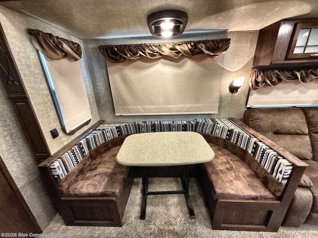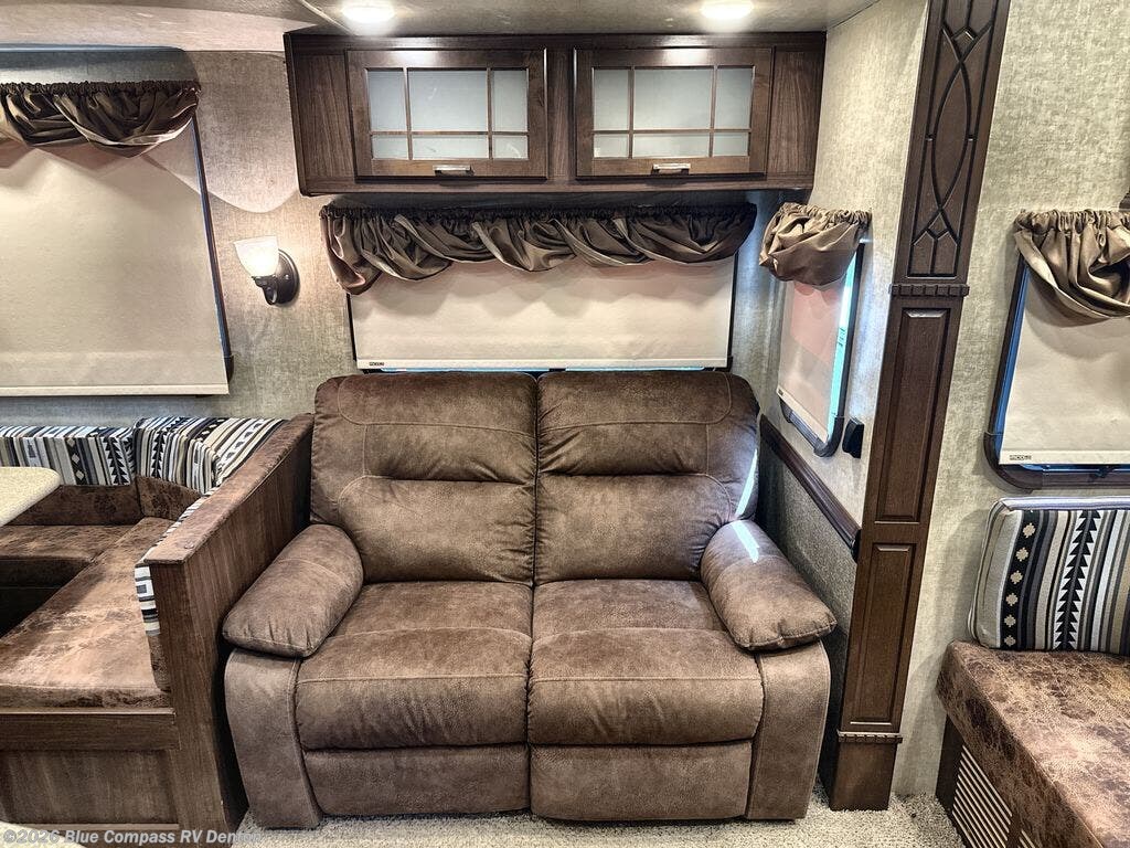 The opposite slide features a large u-shaped dinette for meal times along with a sofa. There is a second sofa along the interior living area wall that provides overhead cabinets for your things.