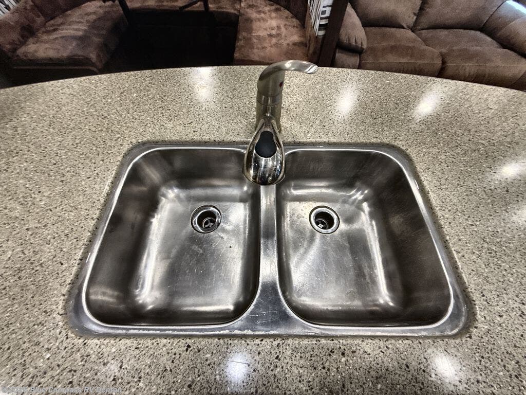 Step inside and see just how roomy this unit is. You will find the kitchen to the left inside the main entry door. There is a refrigerator, three burner range, and pantry slide out. An L-shaped counter top peninsula with two stools and double kitchen sink give it a galley kitchen feel. You will also find a TV located above the counter that can be viewed from any of the seating across the room.