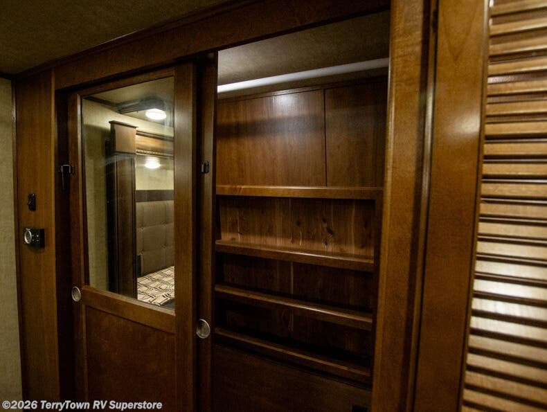 The Charleston bedroom features a queen size bed slide with drawers in the base of the bed for storage. Opposite you will find a dresser. In front along the wall there is a wardrobe with sliding doors including a small dresser on one end, and a washer/dryer prepped wardrobe that can be used for storage or a washer and dryer on the other end if you choose to add.