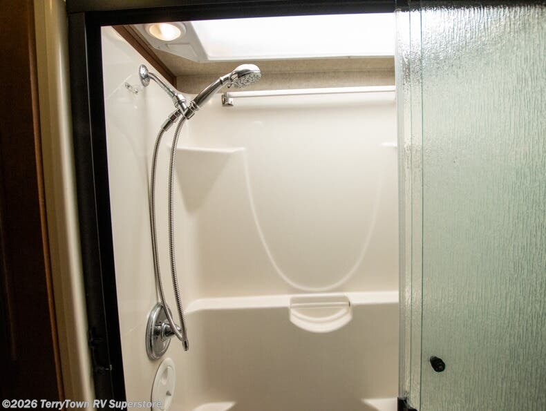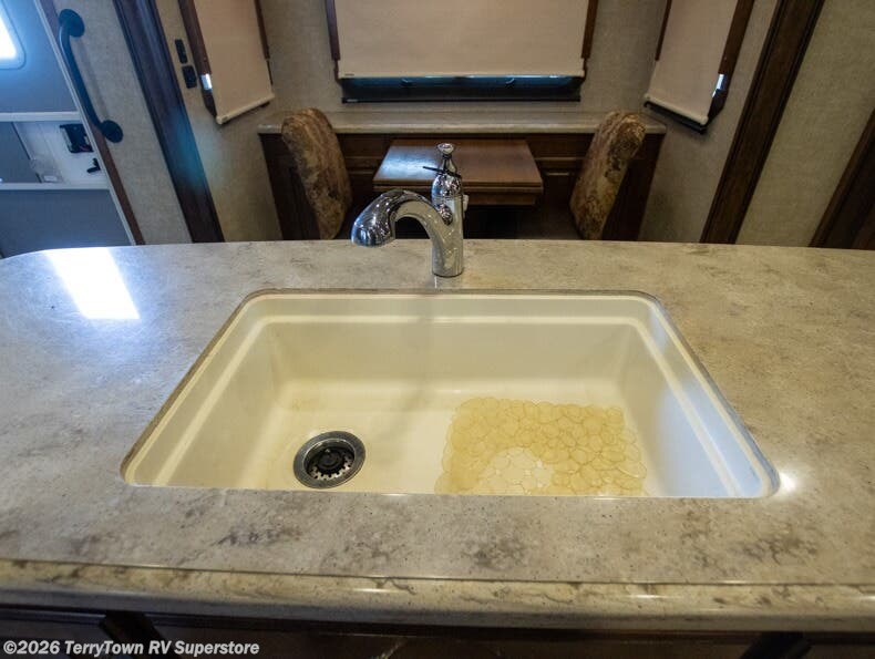 In the living area you will find two more slides, one on each side, with a entertainment center along the curb side and slide out area for two recliners on the road side. Across the rear there is a sofa with end tables, and overhead storage too.