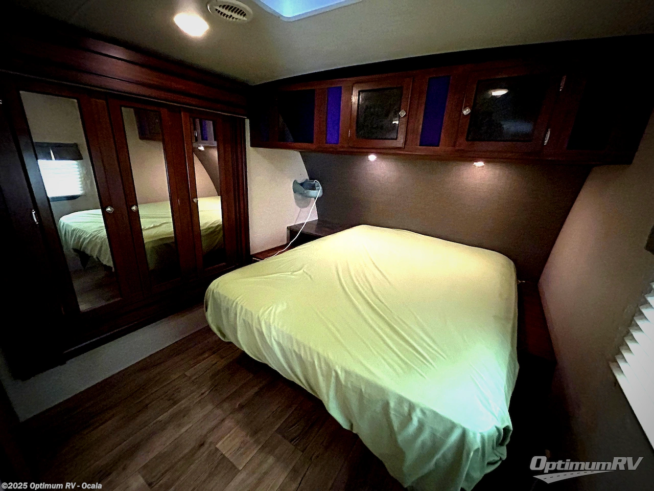 The bedroom provides a queen bed along the front wall with storage on each side, a TV, plus a wardrobe slide on the road side wall for additional space to hang your clothes.
