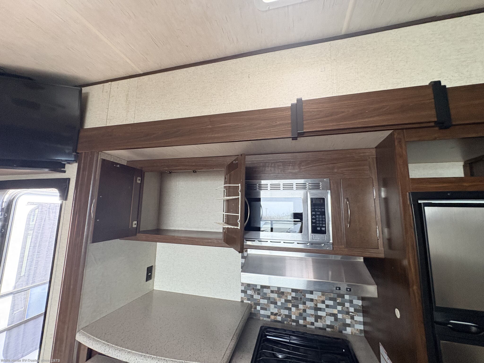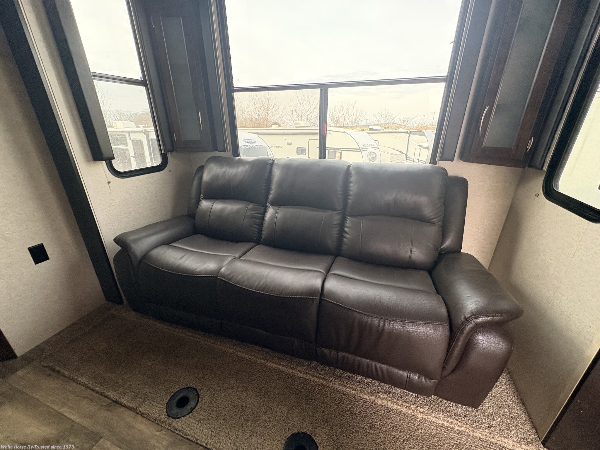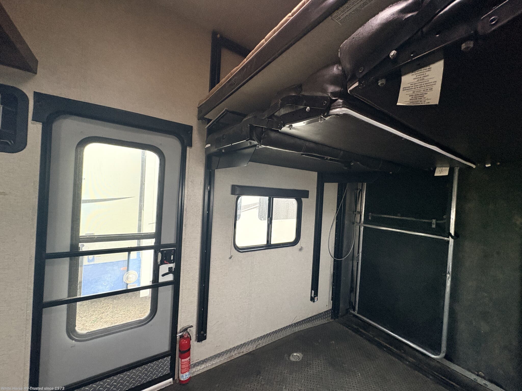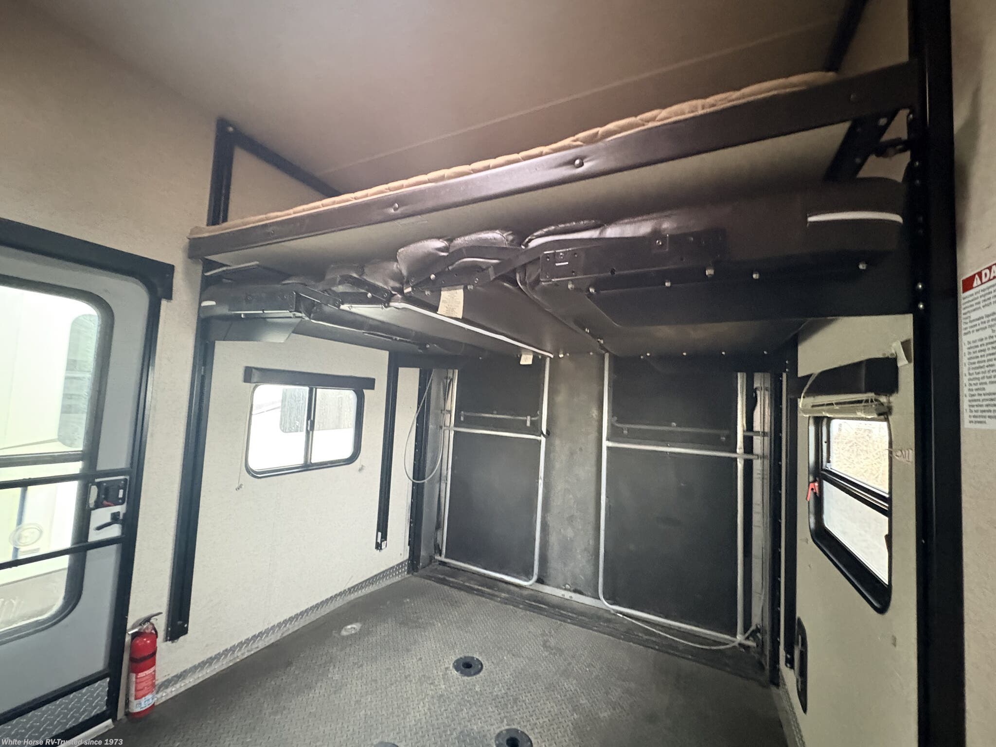 The Torque TQ325 features a family-friendly floor plan -Toy Hauler Fifth Wheel with Front Bedroom for privacy and a Mid-Kitchen layout that makes mealtime preparation convenient whether you’re parked or on the move. The two entry doors provide quick access to front living area and rear cargo area .Three slideouts expand the living room and kitchen, delivering a roomy, home-like atmosphere.