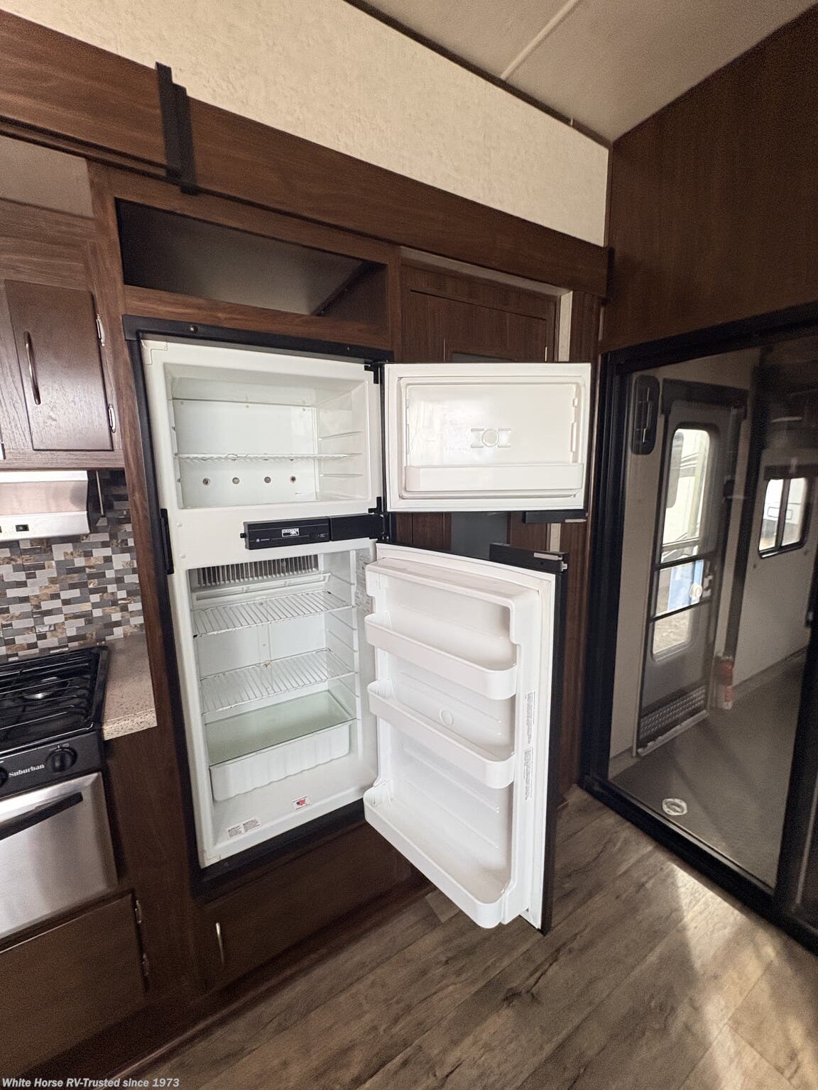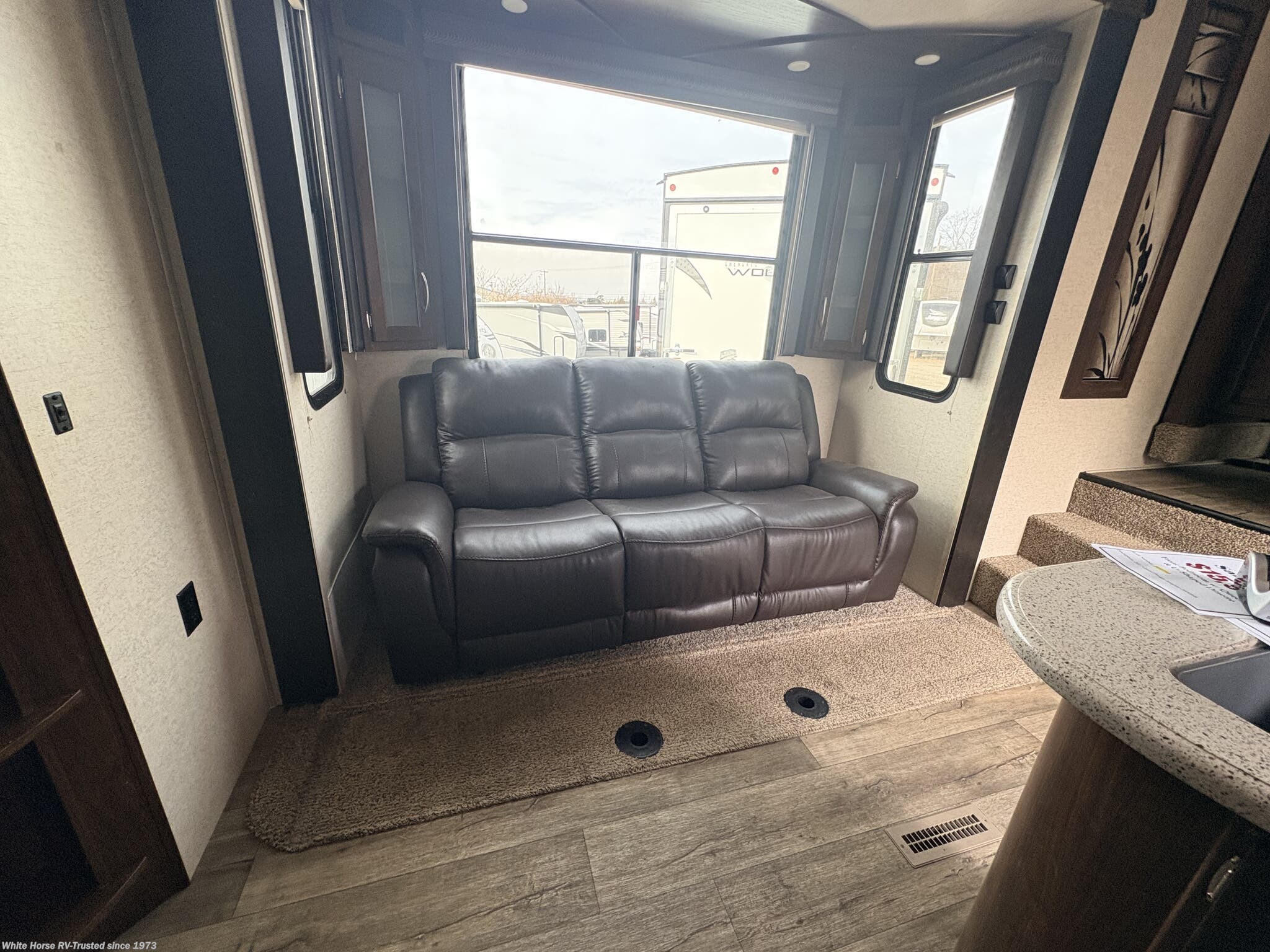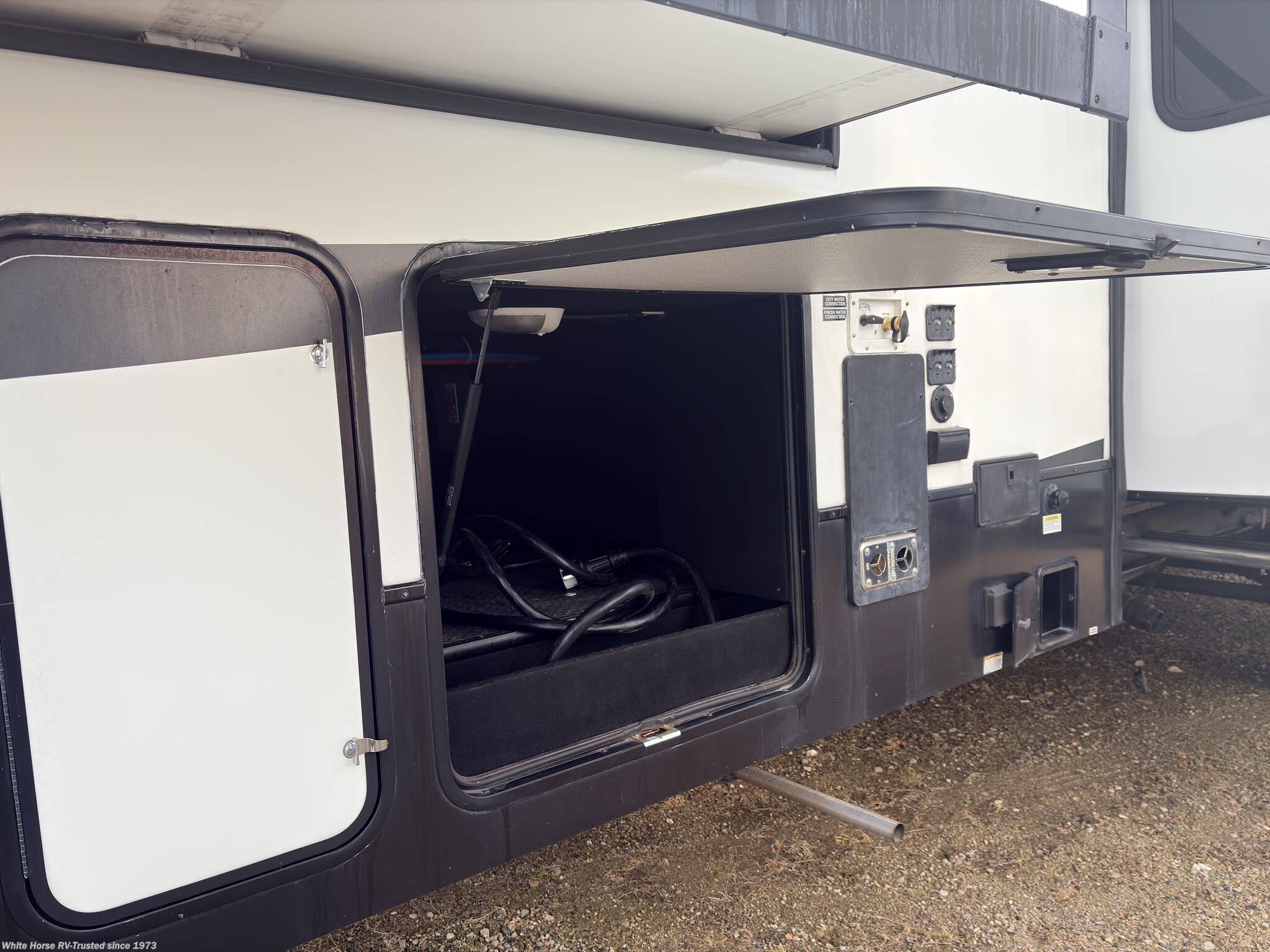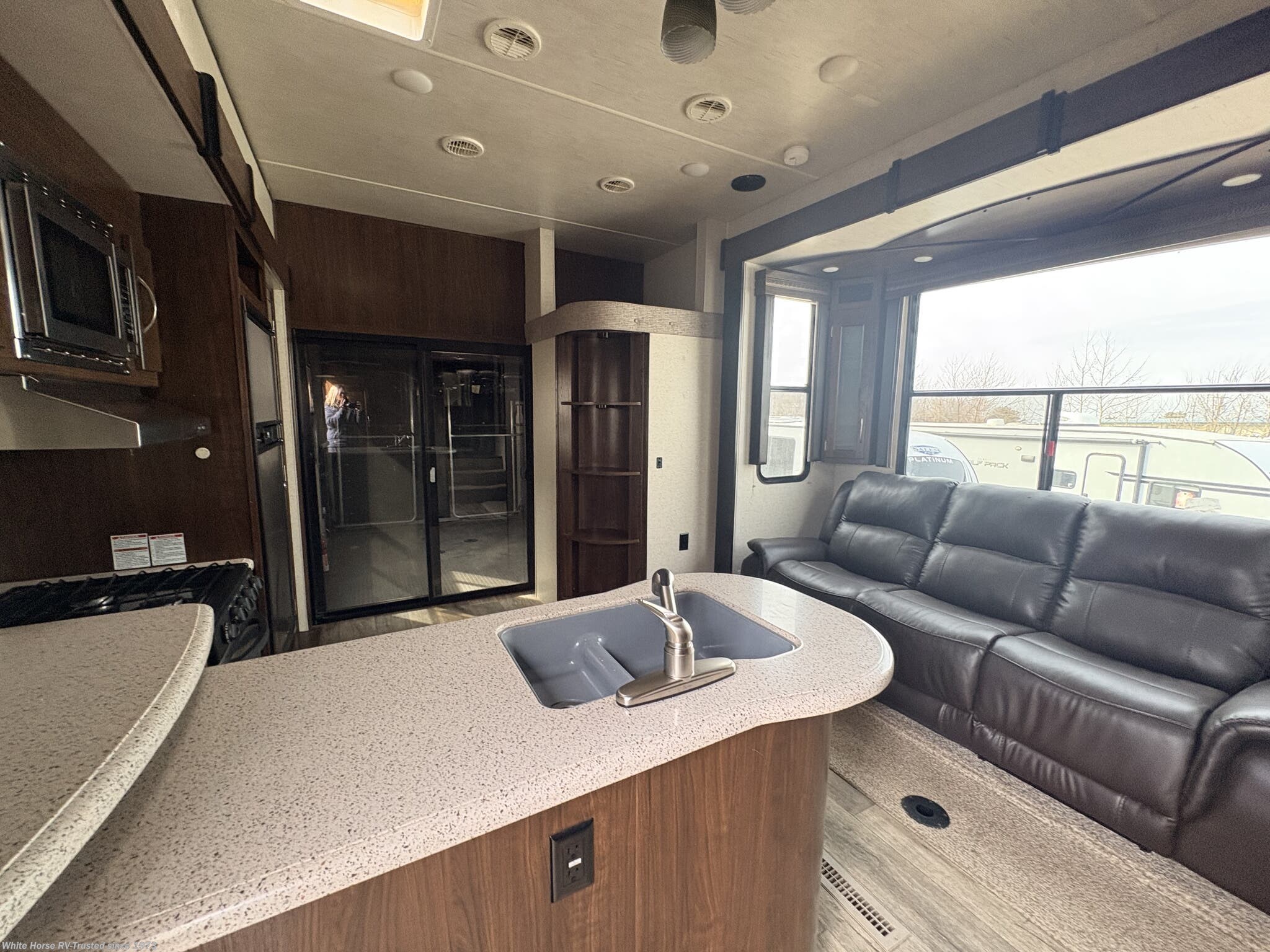 The Torque TQ325 features a family-friendly floor plan -Toy Hauler Fifth Wheel with Front Bedroom for privacy and a Mid-Kitchen layout that makes mealtime preparation convenient whether you’re parked or on the move. The two entry doors provide quick access to front living area and rear cargo area .Three slideouts expand the living room and kitchen, delivering a roomy, home-like atmosphere.