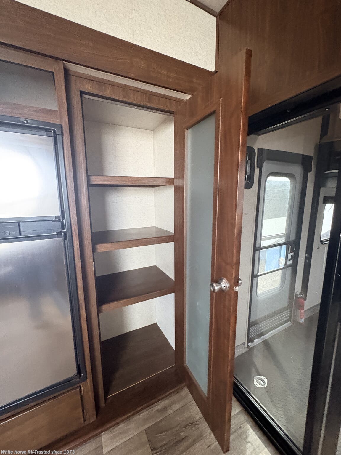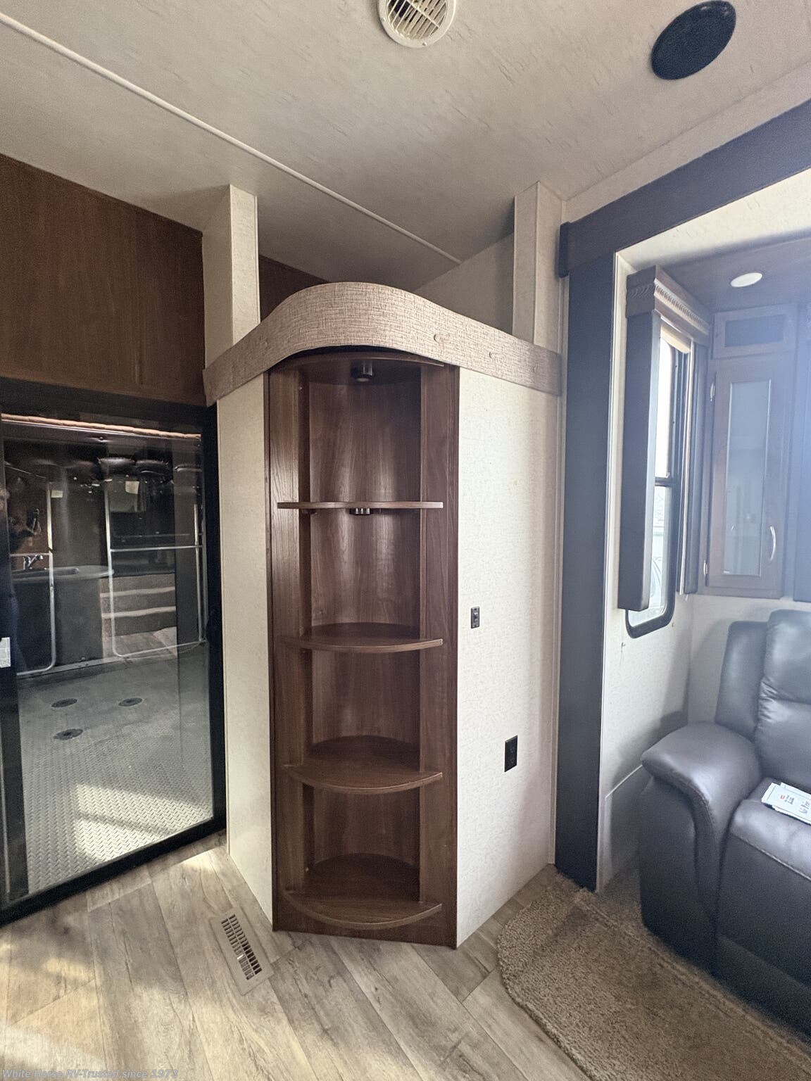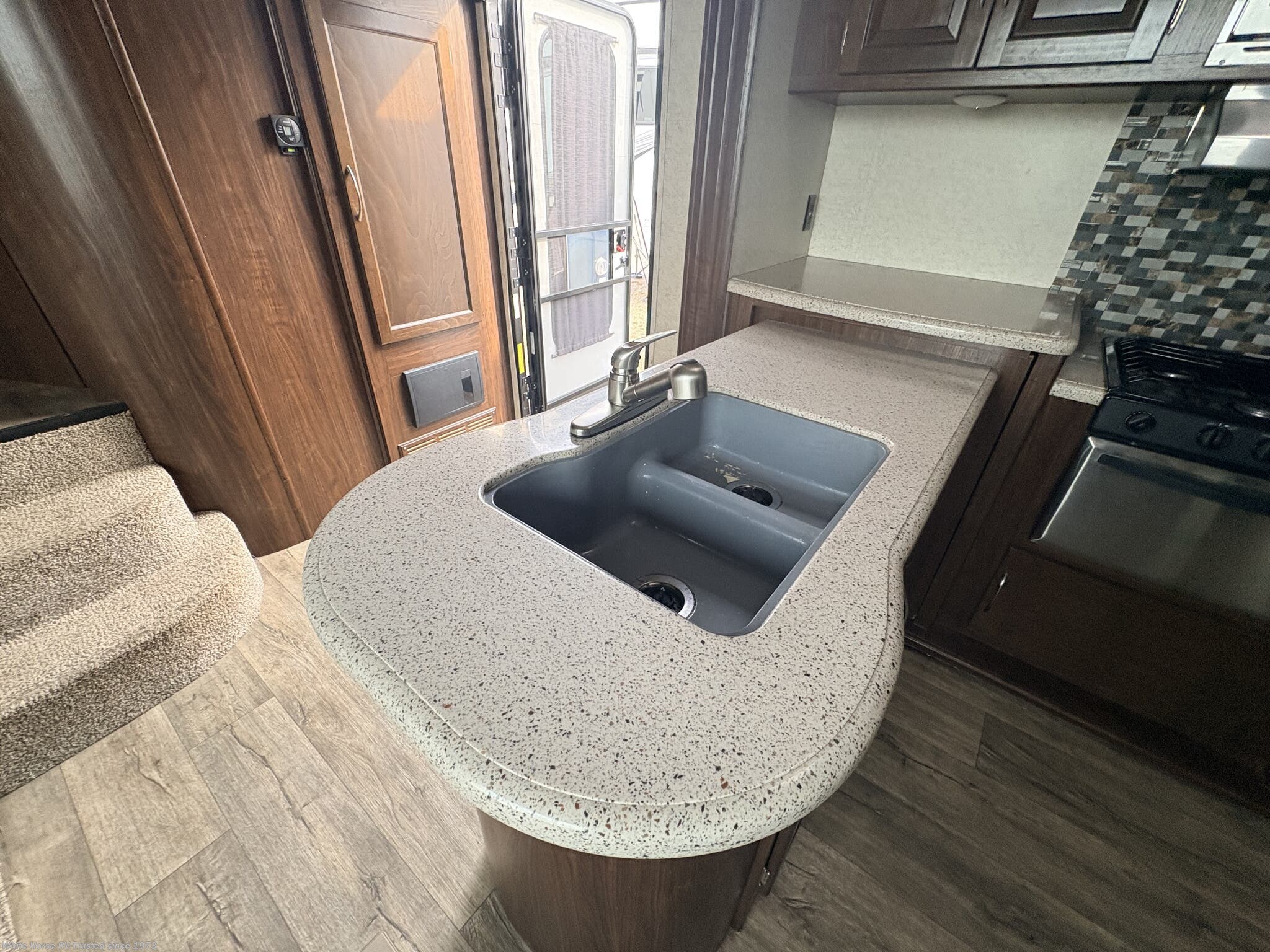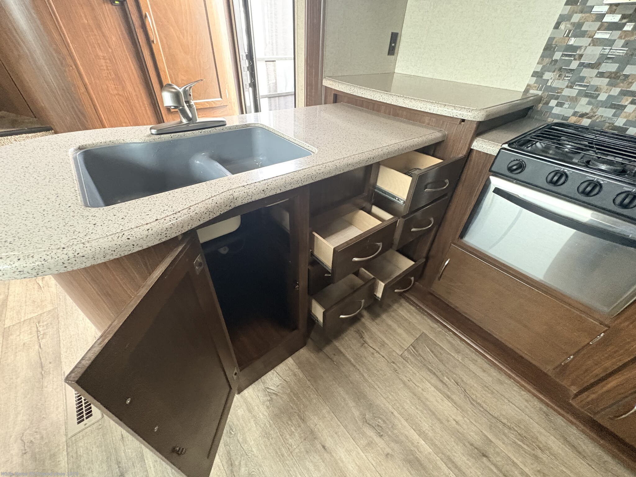 The Torque TQ325 features a family-friendly floor plan -Toy Hauler Fifth Wheel with Front Bedroom for privacy and a Mid-Kitchen layout that makes mealtime preparation convenient whether you’re parked or on the move. The two entry doors provide quick access to front living area and rear cargo area .Three slideouts expand the living room and kitchen, delivering a roomy, home-like atmosphere.