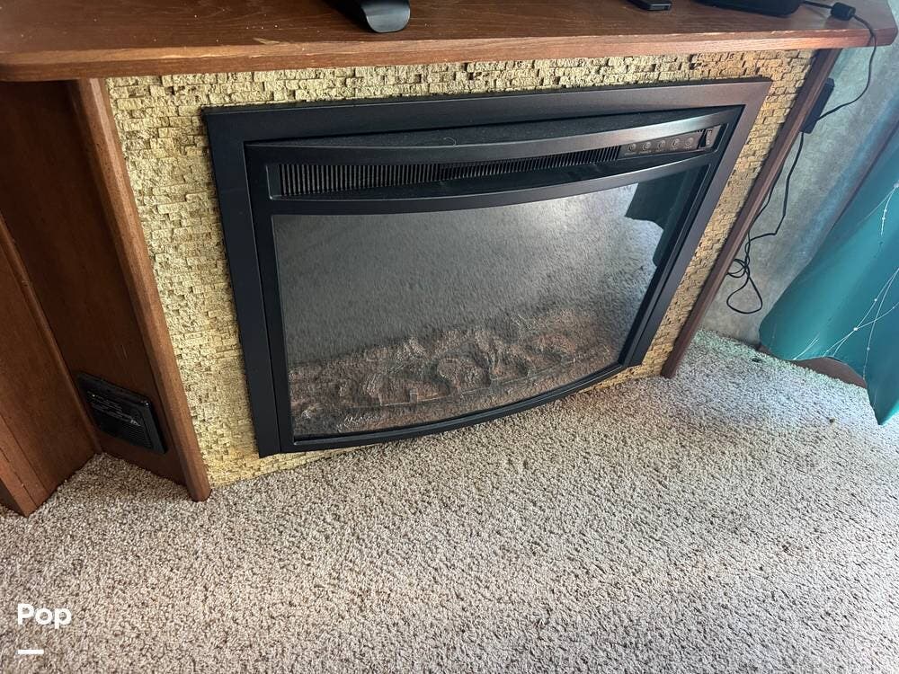 Step inside the rear living floor plan, and you're greeted by a wide-open feel thanks to three large slide-outs. The living area is perfect for relaxing or entertaining, featuring comfortable seating, a spacious sofa, and an entertainment center with a fireplace that adds both warmth and ambiance.