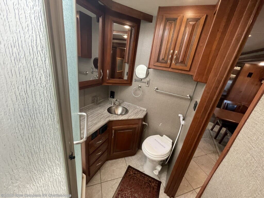 Across from the chest of drawers and first wardrobe in the full slide about mid-coach you will find a complete bath with angled shower, toilet, and corner vanity including a sink. There is also overhead storage. Enjoy the convenience of a second sliding door that leads right into the rear master bedroom.