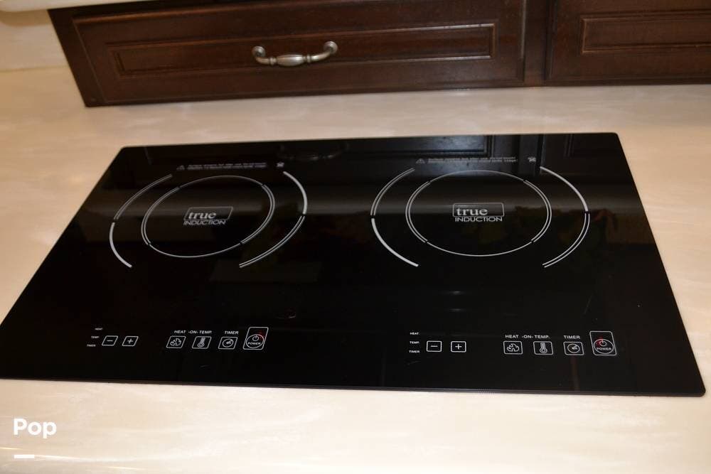 Stainless steel appliances, including microwave/convection oven, induction cooktop (2 burners), vented range fan.