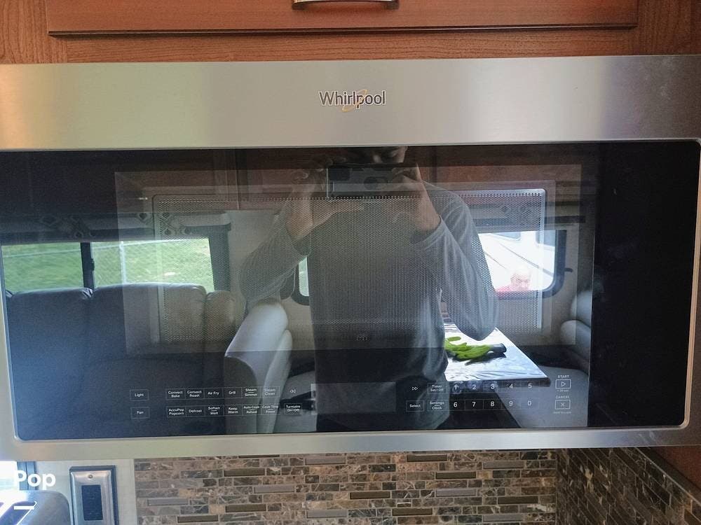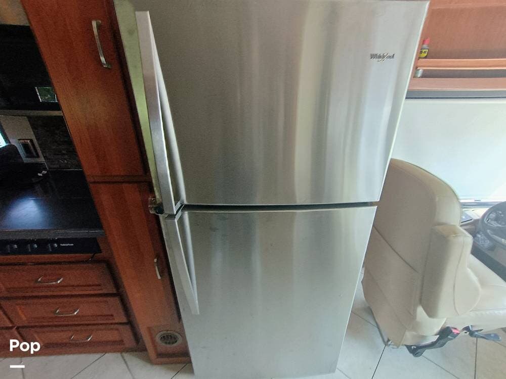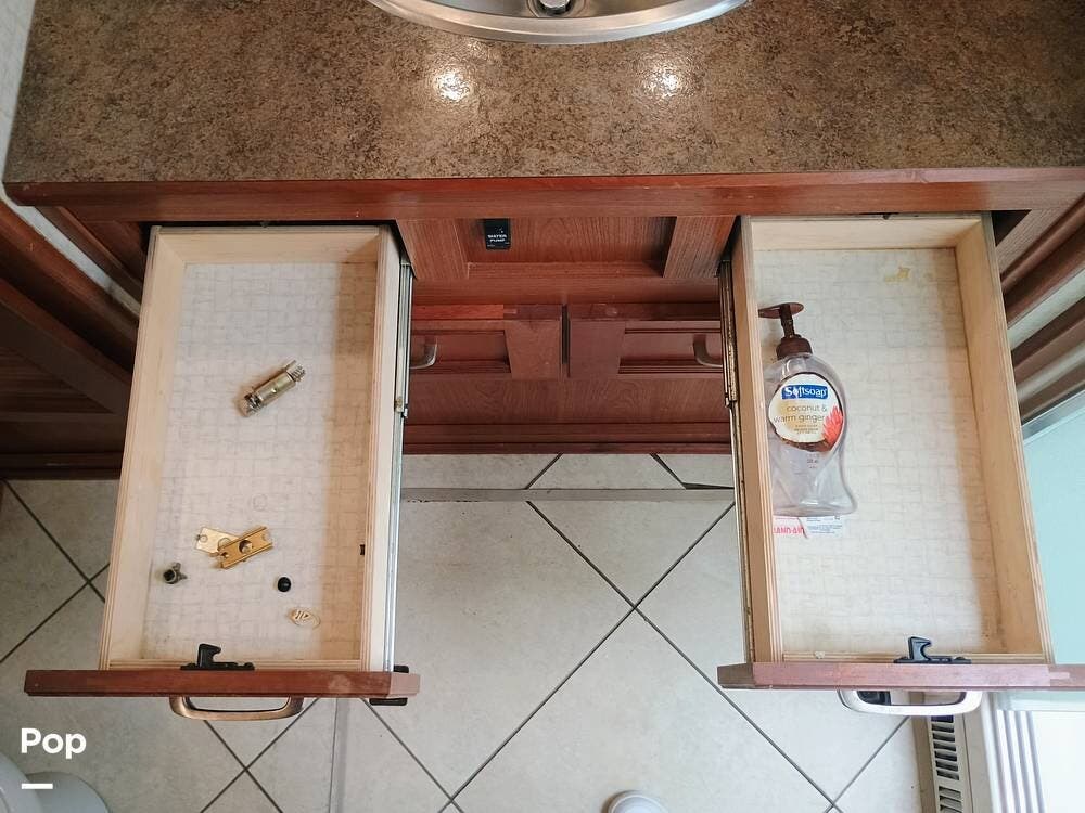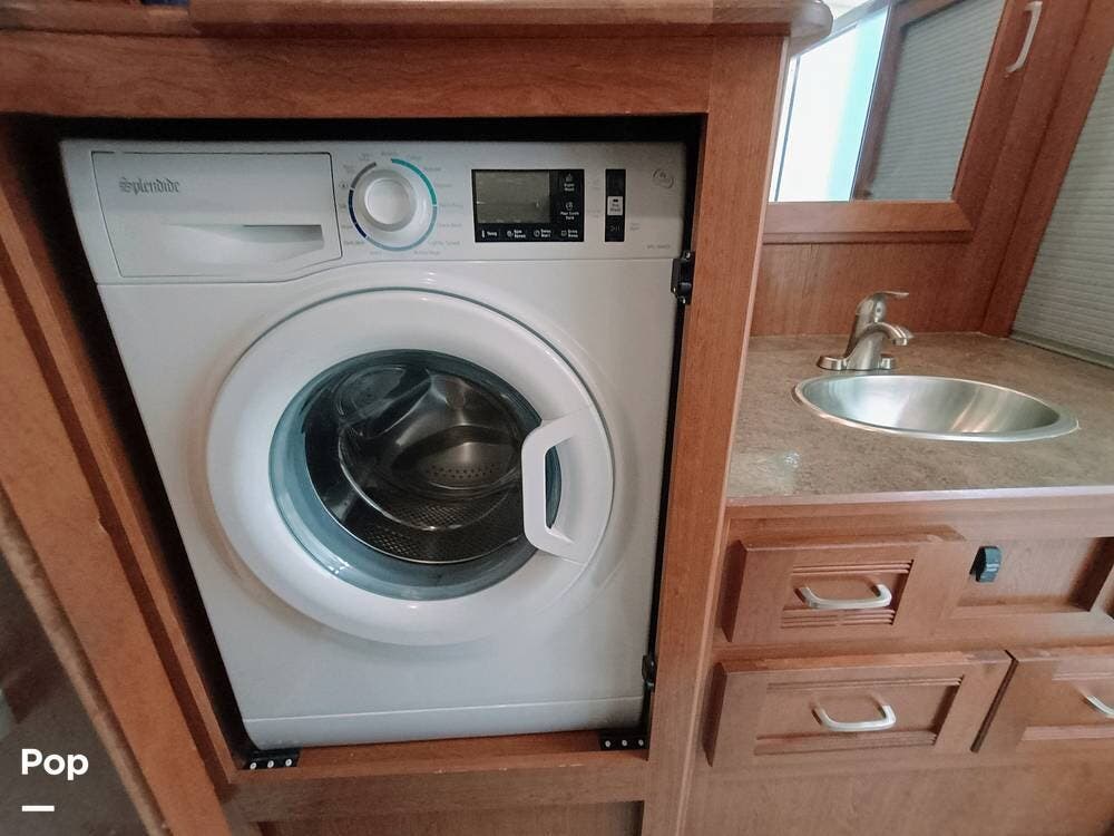 The kitchen is equipped for full-time living or long road trips. You'll find a double sink, solid-surface countertops, a refrigerator with freezer, a microwave, a three-burner stove, and a pantry. The setup makes meal prep easy, whether you're cooking for two or entertaining guests. There is a new refrigerator, new washing machine, and a new microwave/oven.