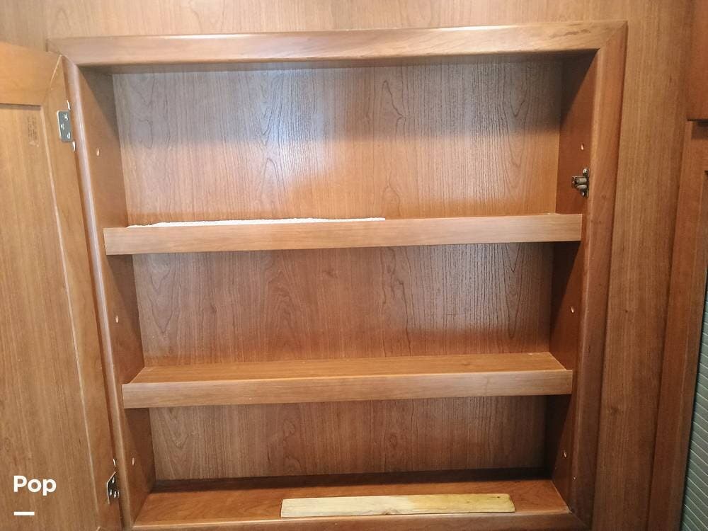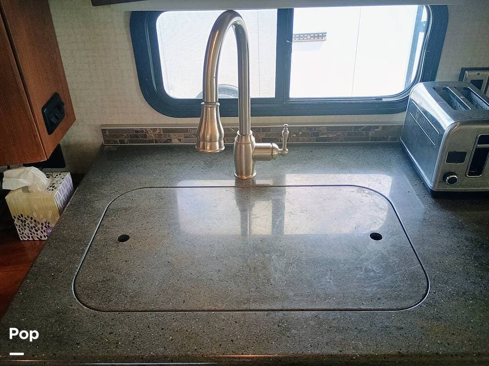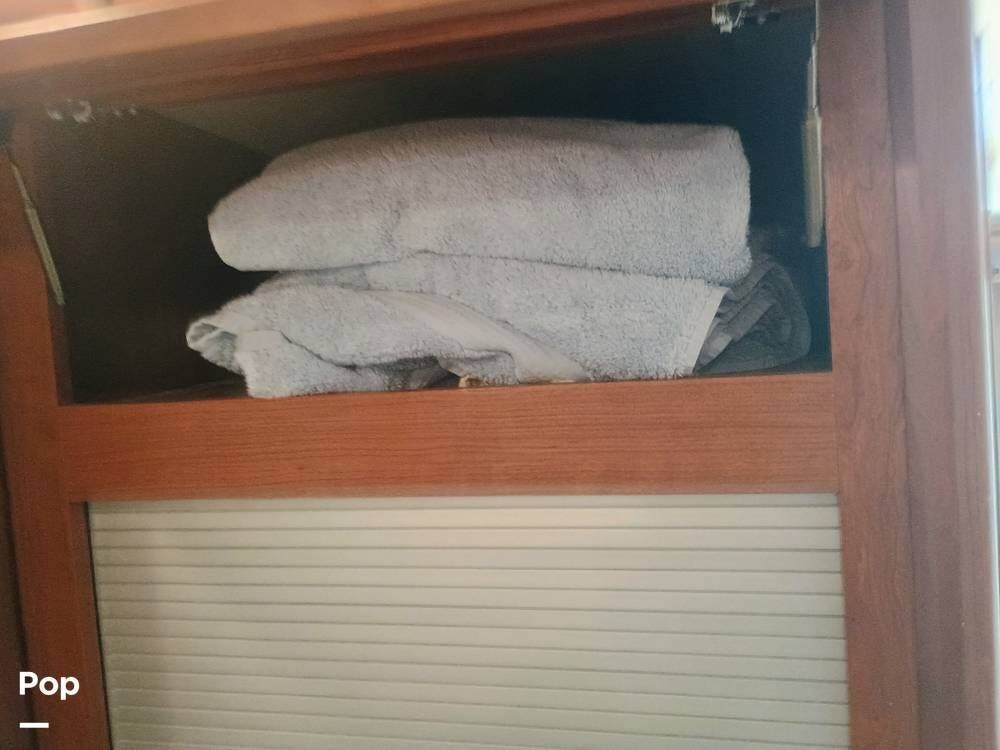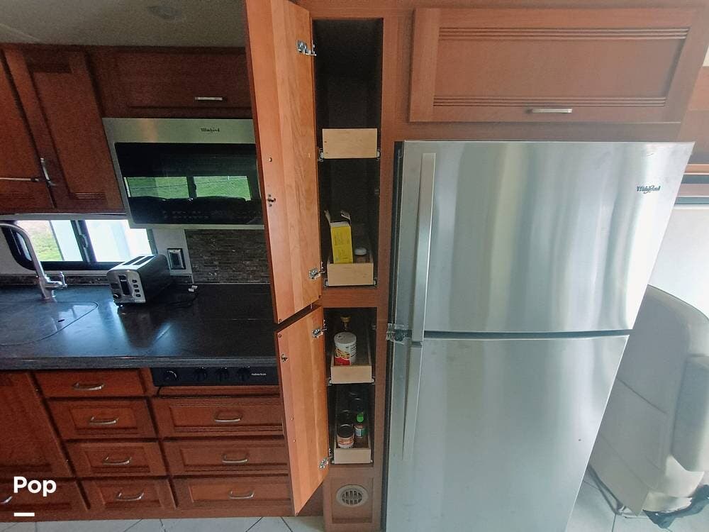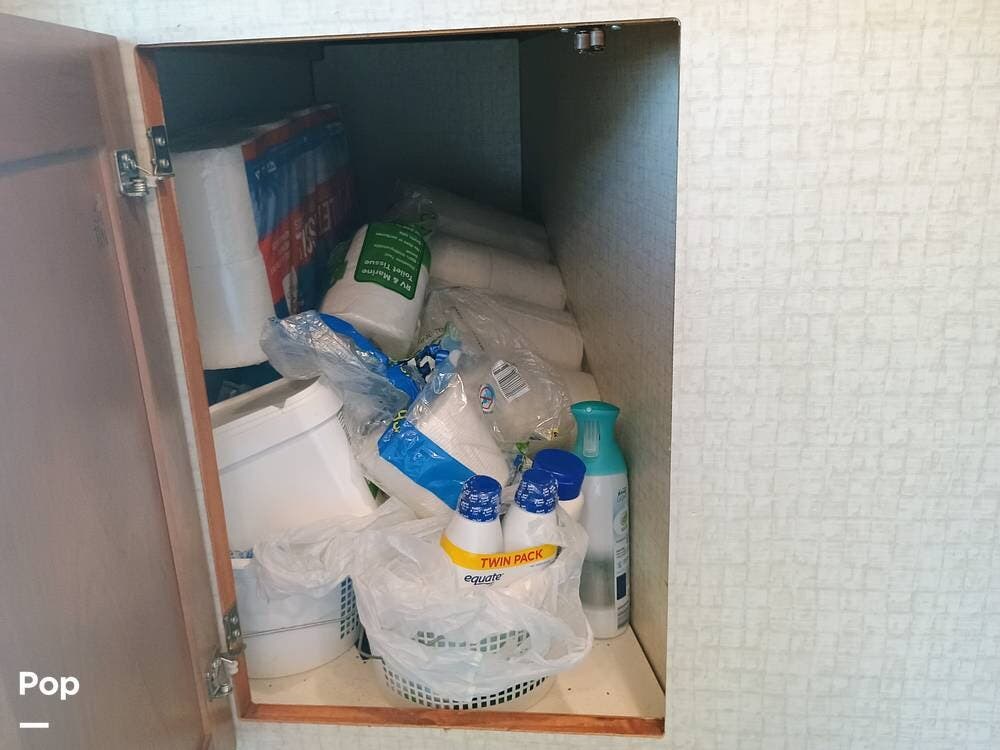 The kitchen is equipped for full-time living or long road trips. You'll find a double sink, solid-surface countertops, a refrigerator with freezer, a microwave, a three-burner stove, and a pantry. The setup makes meal prep easy, whether you're cooking for two or entertaining guests. There is a new refrigerator, new washing machine, and a new microwave/oven.