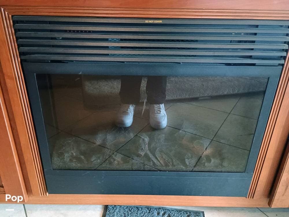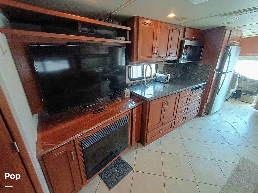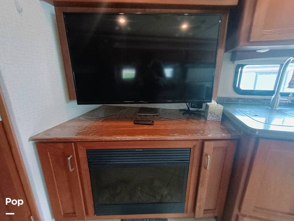 The living area contains plush leather furniture, tile flooring, and solid surface countertops. The coach includes a sofa and a dinette. A fireplace and large flat-screen TV create a cozy entertainment space, while overhead cabinets provide plenty of storage.