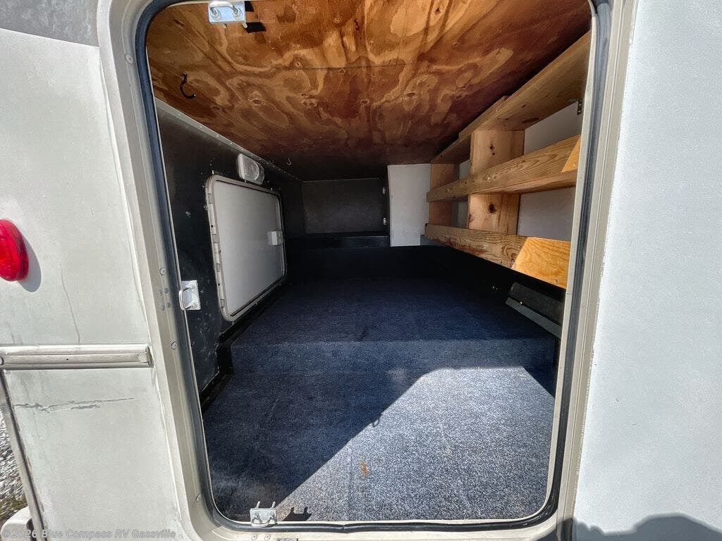 To the left of the entry door there is a counter area with location for a 32" HDTV, a double kitchen sink, and a three burner range, plus refrigerator. If you need more sleeping space choose the optional Studio Loft powered bed that is 32" x 89".