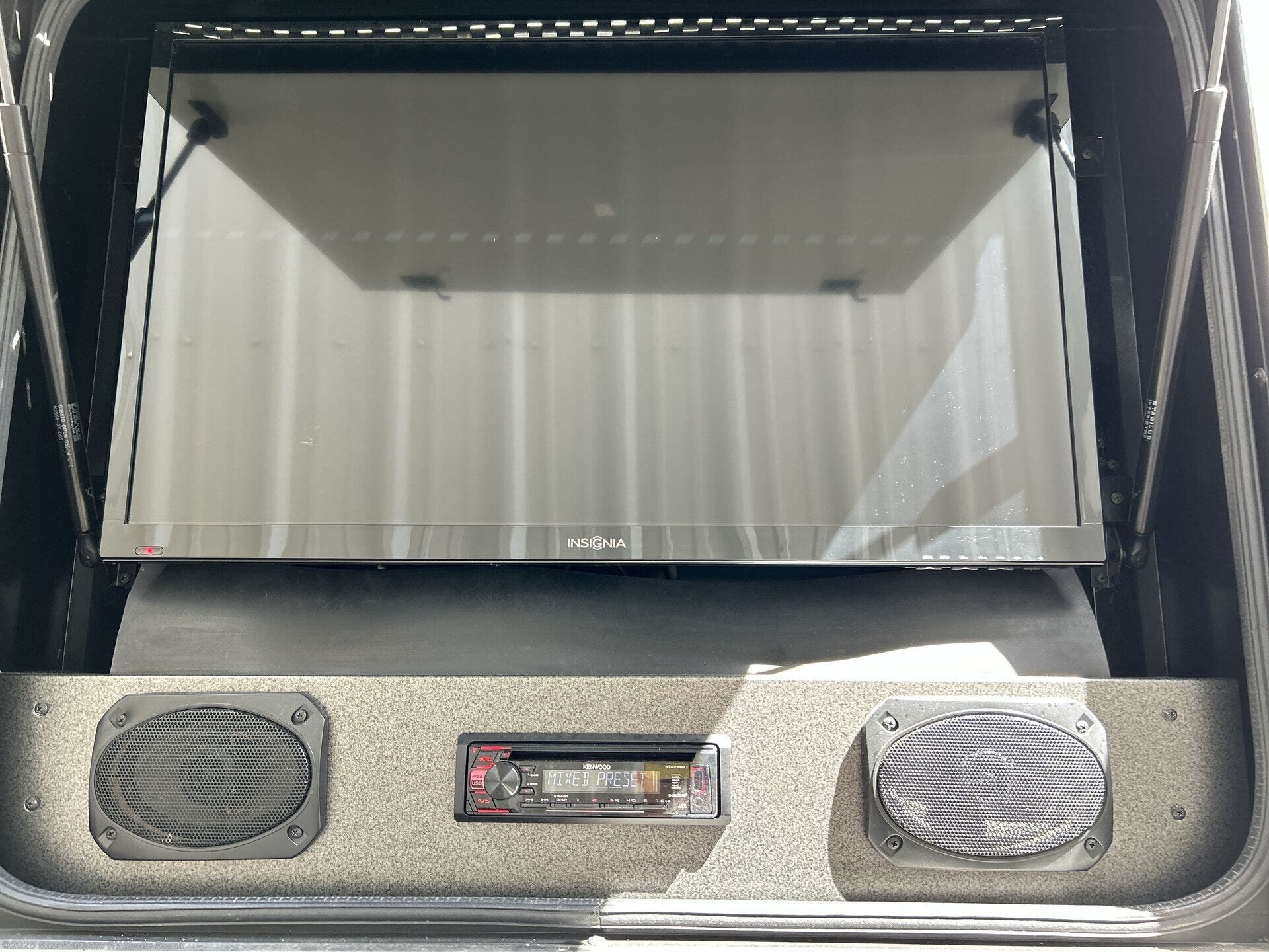 A sliding door leads to the rear master suite and full bath. The bedroom provides a slide out queen size bed with nightstands and overhead storage. The opposite wall features a storage cabinet in the center of two wardrobes, plus it is the location of an optional 32" HD TV.