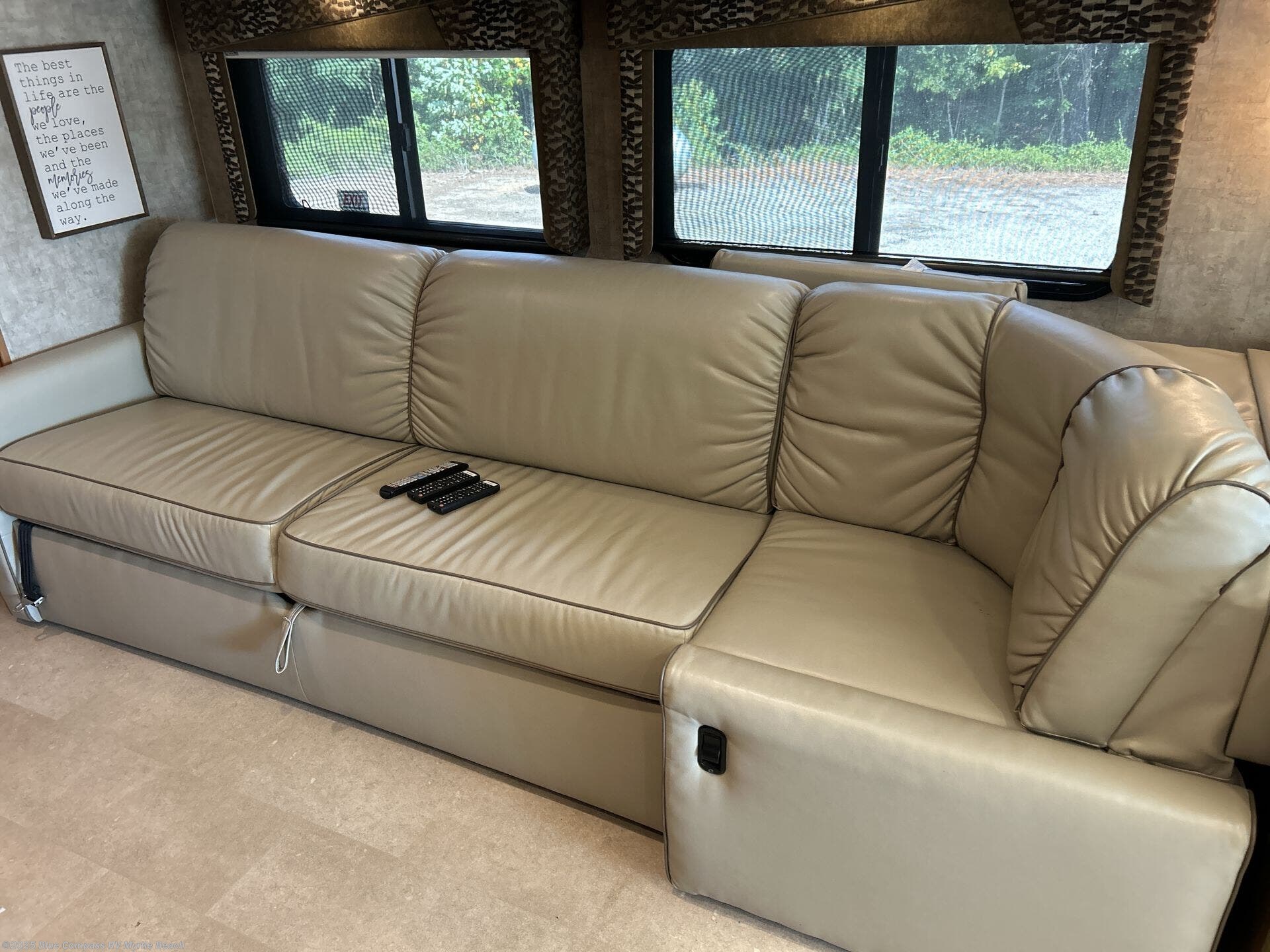 As you enter notice the large slide out opposite the door that features a dinette and extendable sectional sofa. You can also choose the BenchMark Dinette instead. All feature seat belts so you can safely travel in the back of the coach.