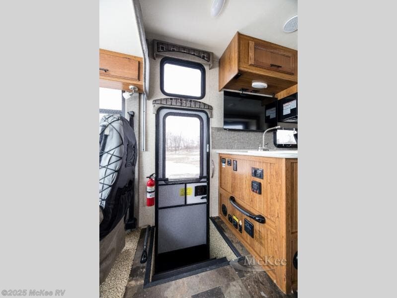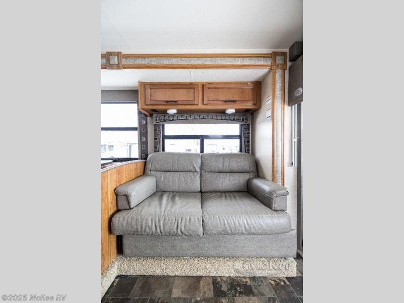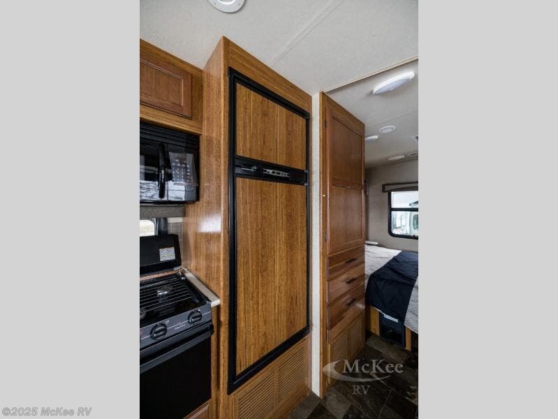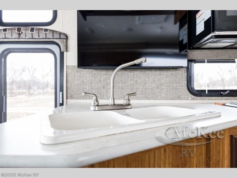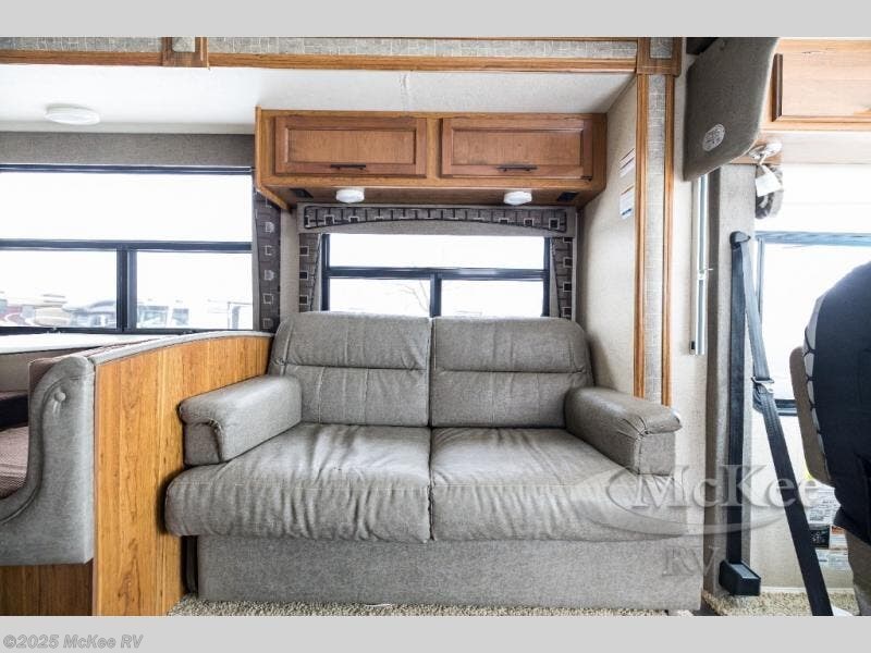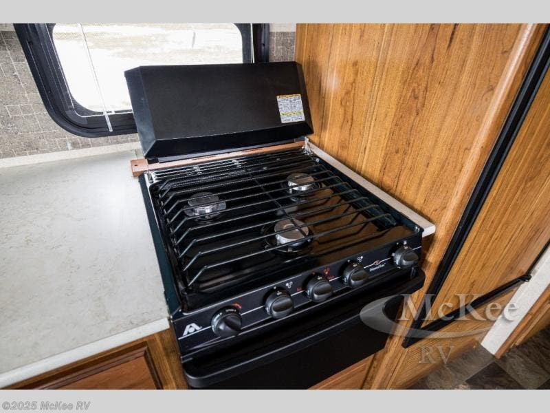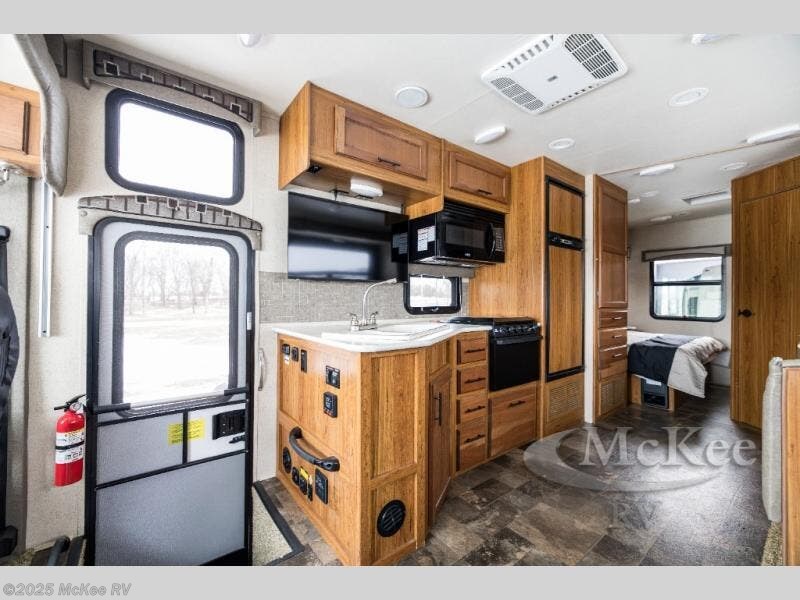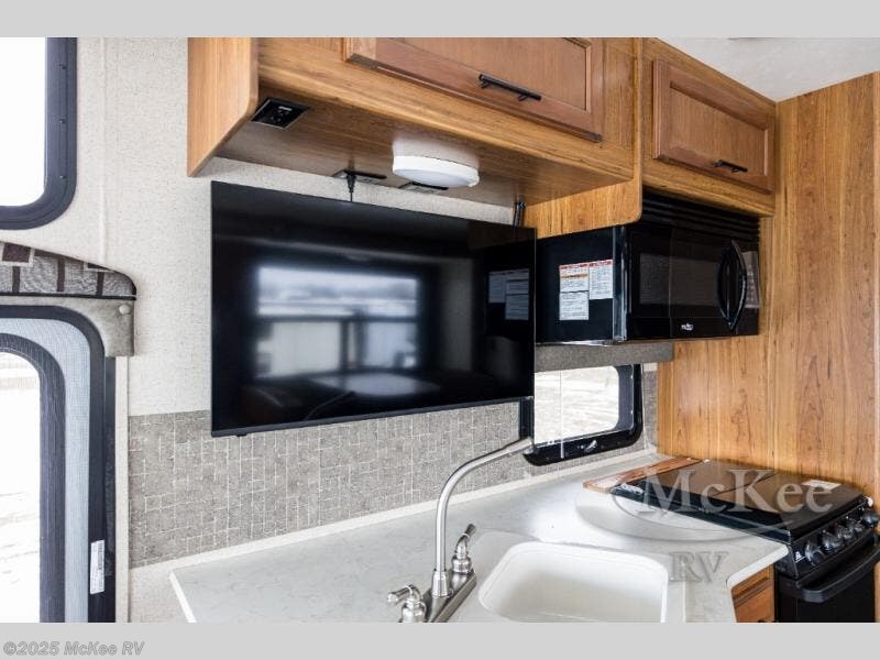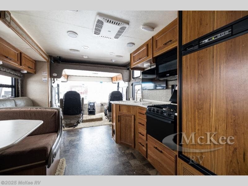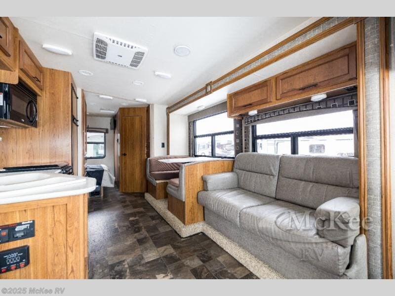 Step inside the motor home and see how spacious and open the living and kitchen areas are with the slide that is located behind the driver's seat. The slide has a sofa with an overhead cabinet and a dinette. Above the cab area you can choose to an optional drop down bunk. Behind the passengers seat, the kitchen area has an angled double kitchen sink, overhead 39" TV, microwave, three burner range, and refrigerator.