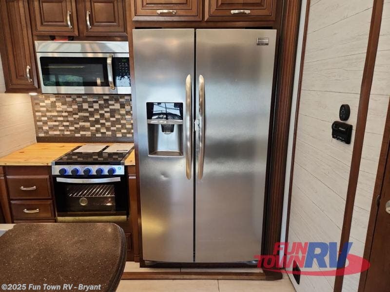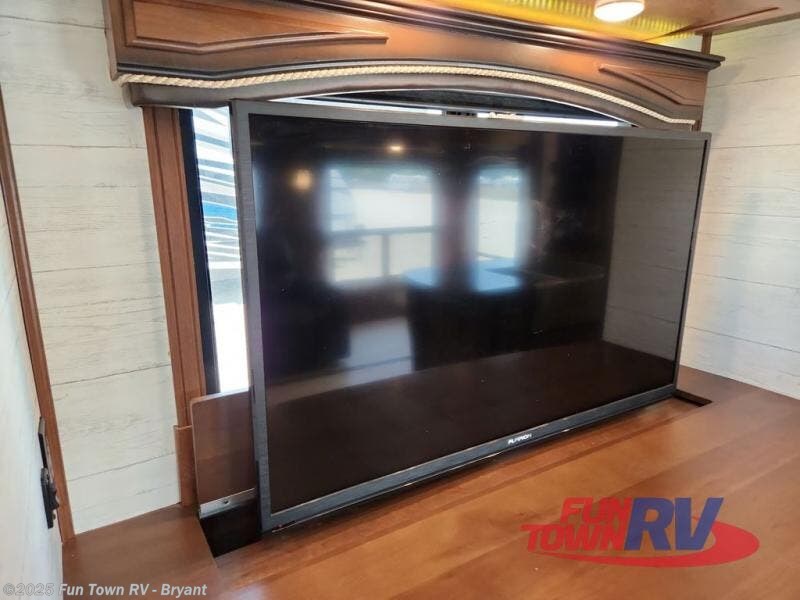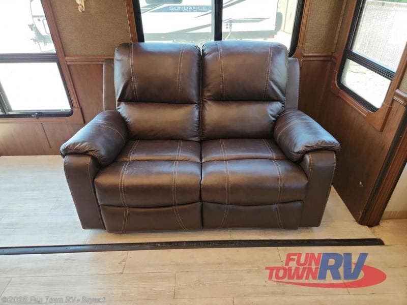 Enter and find an open concept kitchen and living area with dual opposing slides. There is a dinette and power theater seating for two along the curb side slide out. Opposite you will find a slide out that contains the kitchen appliances and an entertainment center with 50" TV lift including a fireplace below.