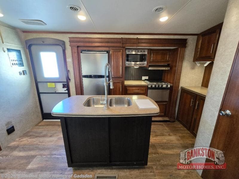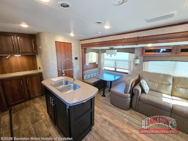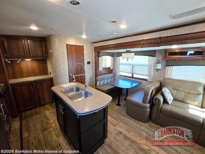 As you step inside to the left is a slide with a refrigerator, pantry, microwave, and three burner range. You will also find a hutch with overhead cabinets along one interior wall. The kitchen island has a double sink and extra countertop space. There is another slide in the kitchen/living area with a booth dinette and a hide-a-bed sofa with overhead cabinets. From the sofa and dinette you can easily view and enjoy the angled entertainment center.