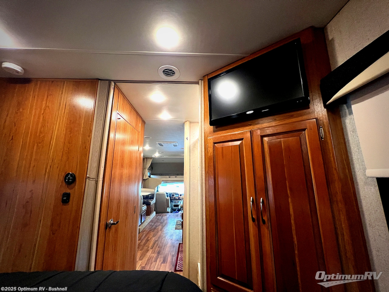 Starting in the rear of the 31FK Greyhawk motor home by Jayco, you will be in the bedroom. You will find a wardrobe, queen bed, nightstand, and a corner TV cabinet.