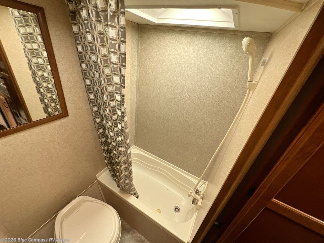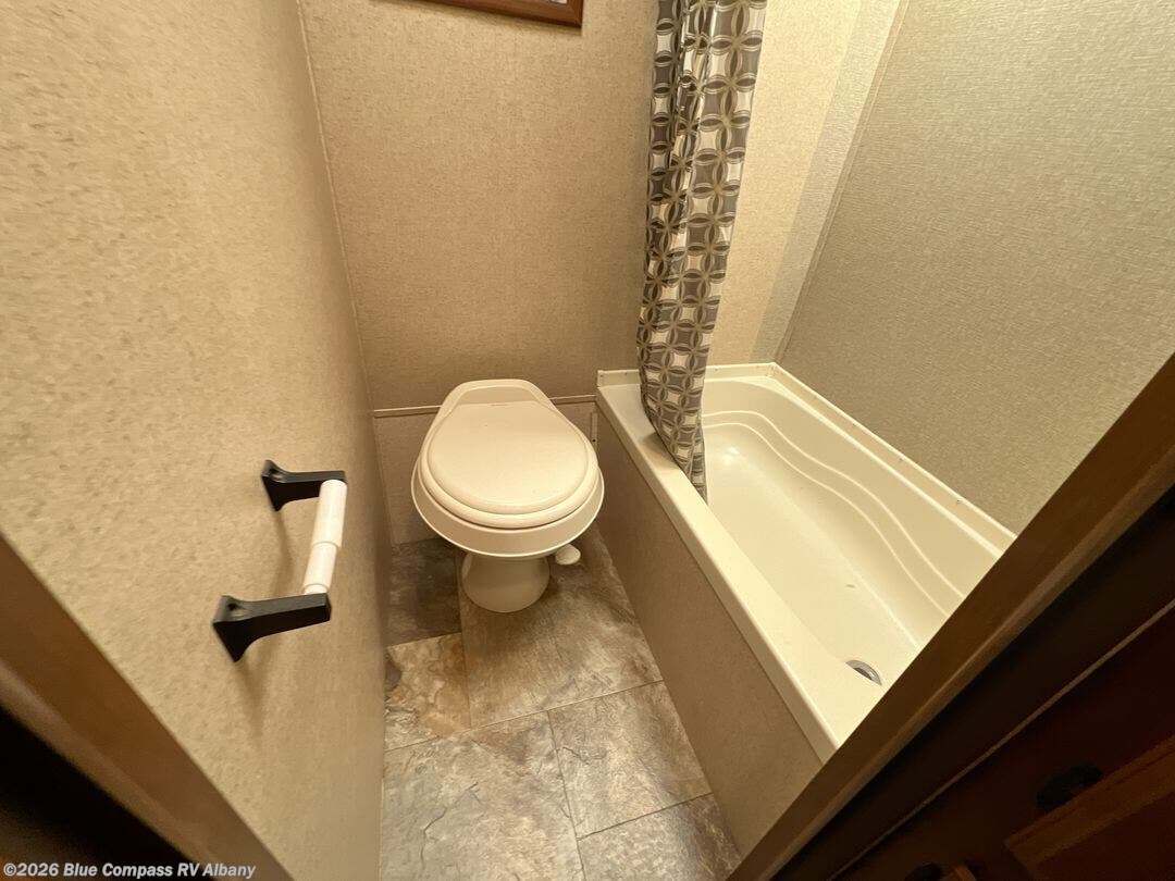 There are bunk beds in the rear left corner of the trailer. In the rear right corner you will find the bathroom with a toilet and tub/shower.