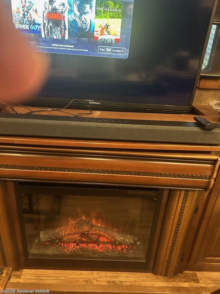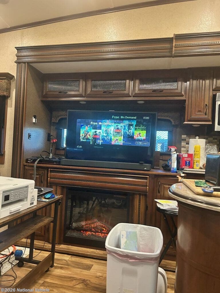 The heart of this coach is its upscale, residential-style kitchen and lounge: a center island with a double sink, solid surface counters, hardwood cabinetry, recliners, and a premium entertainment system with a fireplace below create the feel of a high-end home. Large panoramic windows, elegant flooring transitions, and ambient lighting enhance the atmosphere and comfort.