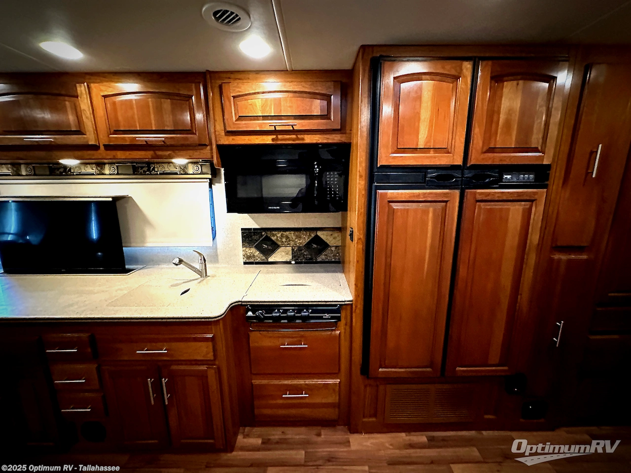 Along the door side of the motor home there is extra counter space for food prep, a 39" TV lift, double kitchen sink, four burner range, microwave, 8 cu. ft. refrigerator for your perishables, and two pantries for your dry goods. The slide along the road side has a hide-a-bed sofa with an overhead cabinet above the sofa, and next to the sofa there is a dinette where you can enjoy your meals.