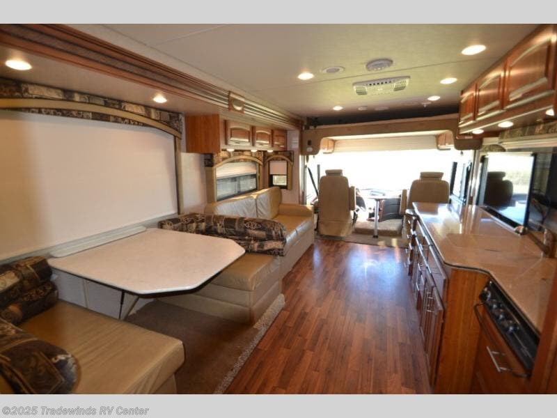 Along the door side of the motor home there is extra counter space for food prep, a 39" TV lift, double kitchen sink, four burner range, microwave, 8 cu. ft. refrigerator for your perishables, and two pantries for your dry goods. The slide along the road side has a hide-a-bed sofa with an overhead cabinet above the sofa, and next to the sofa there is a dinette where you can enjoy your meals.