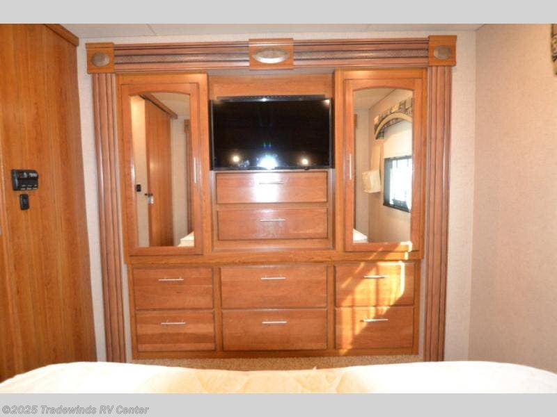 After a fun filled day of adventure find yourself retreating to the rear bedroom where you'll find a king bed. Above the bed there is an overhead cabinet. The bed is on a slide which helps to open up the floor space in the bedroom. Across from the bed you will find another slide with two wardrobes, an overhead cabinet, and a 32" TV.