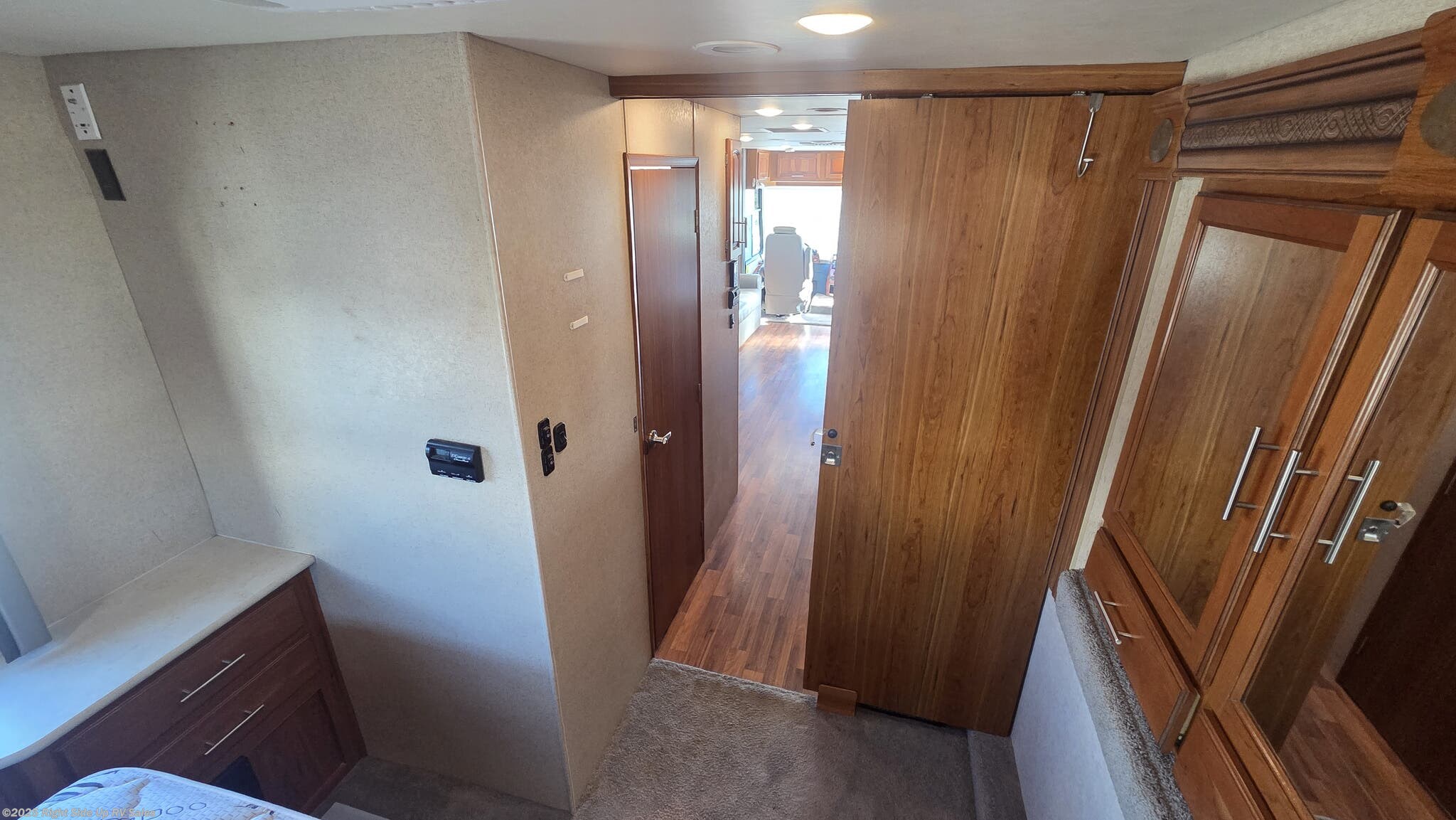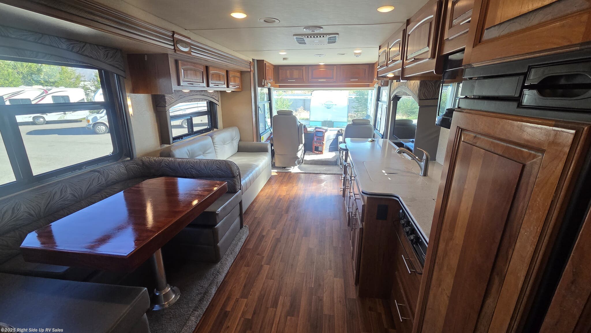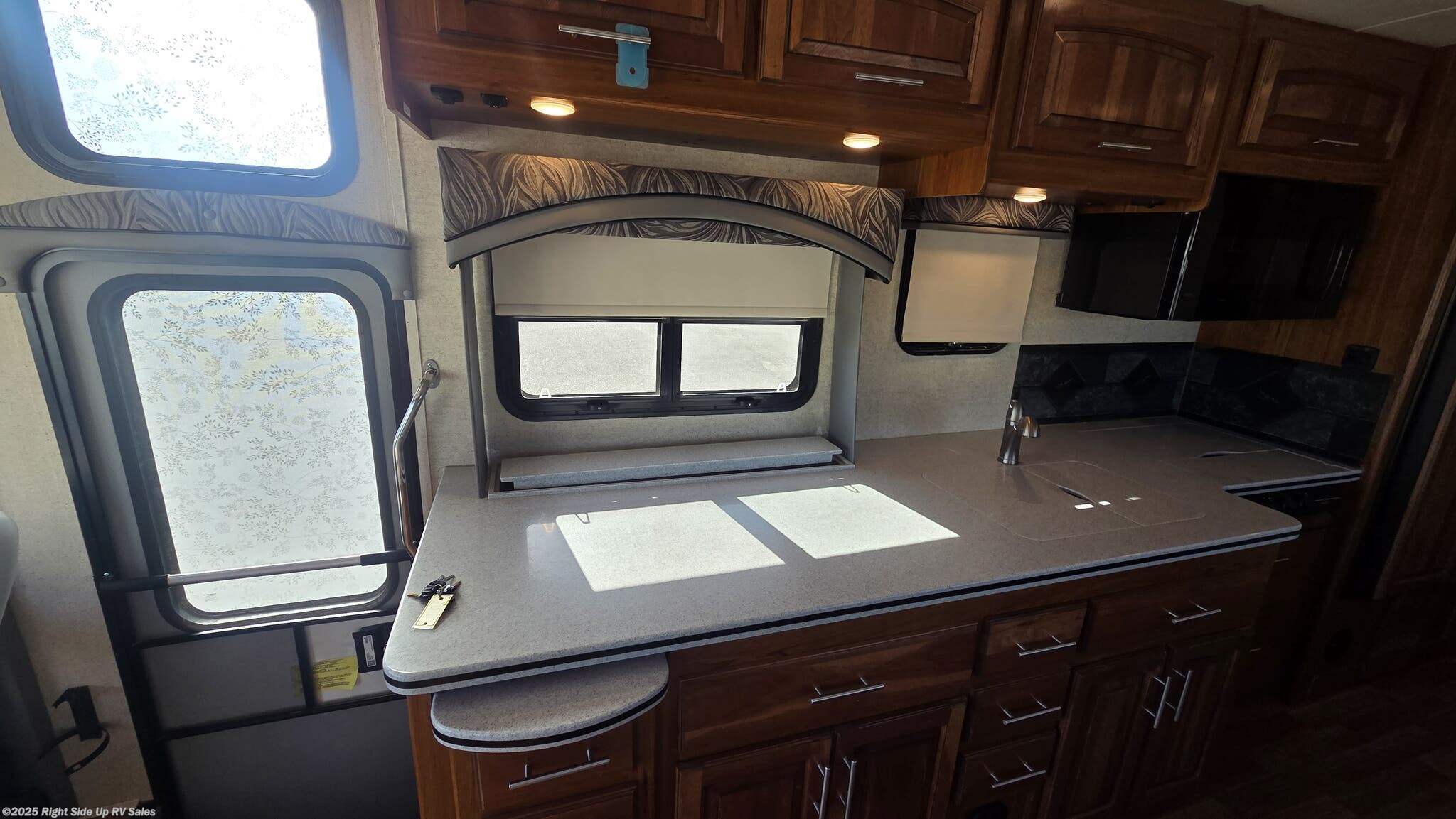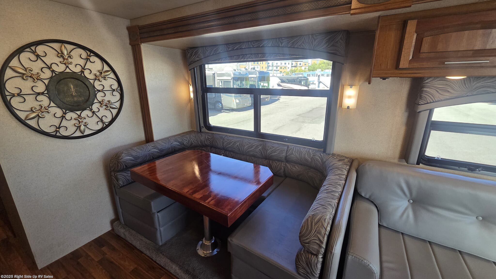 The 35UN floorplan creates an open living space with slide-out expansion and a private rear bedroom. The living area includes a jackknife sofa and booth dinette for flexible seating and sleeping. The galley offers solid-surface countertops, 3-burner cooktop, convection microwave, double sink, and a gas/electric refrigerator. The bedroom features a queen bed with dual wardrobes and storage. The full bath provides a shower, toilet, and vanity. Exterior entertainment and a power patio awning round out this well-equipped coach.