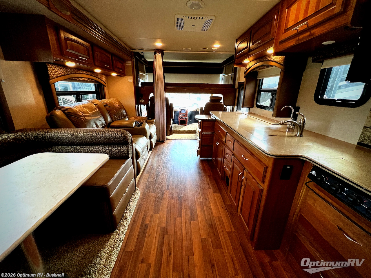To the left of the entrance there is a counter top with drawers, 39" TV, double kitchen sink, microwave, four burner range, 8 cu. ft. refrigerator or an optional 12 cu. ft. refrigerator, and two pantries. The opposite side of the motor home has a slide with a u-dinette and a hide-a-bed sofa. Above the sofa there is an overhead cabinet. Above the cab you will find an optional drop-down bunk. This is a great spot for your kids or grandkids to sleep.
