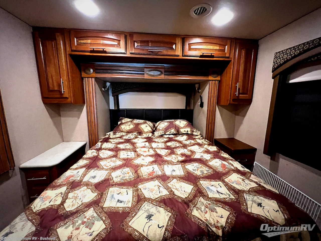 In the rear bedroom you will find a large dresser along one side of the room. The queen bed slides out and there is an overhead cabinet above the bed, and a nightstand along one side of the bed. You will also find another slide which has a large wardrobe.